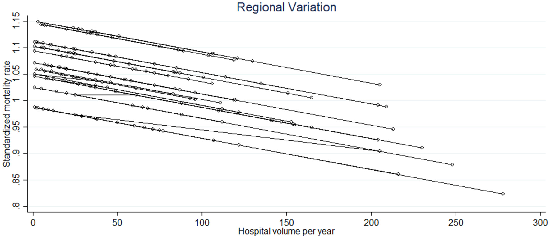 To estimate the potential influence of hospital volume on the SMR, we also studied the relationship between hospital volume and SMR by calculating a linear trend.