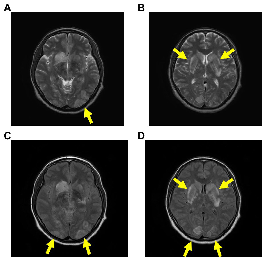 Head MRI on admission. The head MRI reveals caudate nucleus hemorrhage and PRES, with hyperintense signals on T2 (A,B) and FLAIR (C,D) sequences in the bilateral occipital regions, caudate nucleus, and putamen. Abbreviations: MRI, magnetic resonance imaging; PRES, posterior reversible encephalopathy syndrome; FLAIR, fluid-attenuated inversion recovery.