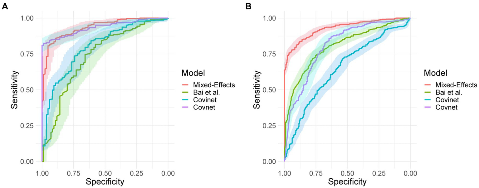 To assess the added benefit of using our mixed-effects method, we compare against networks that use alternative methods. Both COVNet (7) and a method proposed by Bai et al. (8) propose deep learning models that consider the slices separately before concatenating the features using max pooling. COVNet uses a ResNet50 (38) CNN to extract features and pooling layers to concatenate the features before a fully connected classification layer. The model proposed by Bai et al. uses EfficientNetB4 (39) to extract features followed by a series of full-connected layers with batch normalization and dropout; average pooling is then used to concatenate the feature vectors before classification. While max pooling is simple and computationally efficient, it cannot deal with pose variance and does not model the relationship between slices.