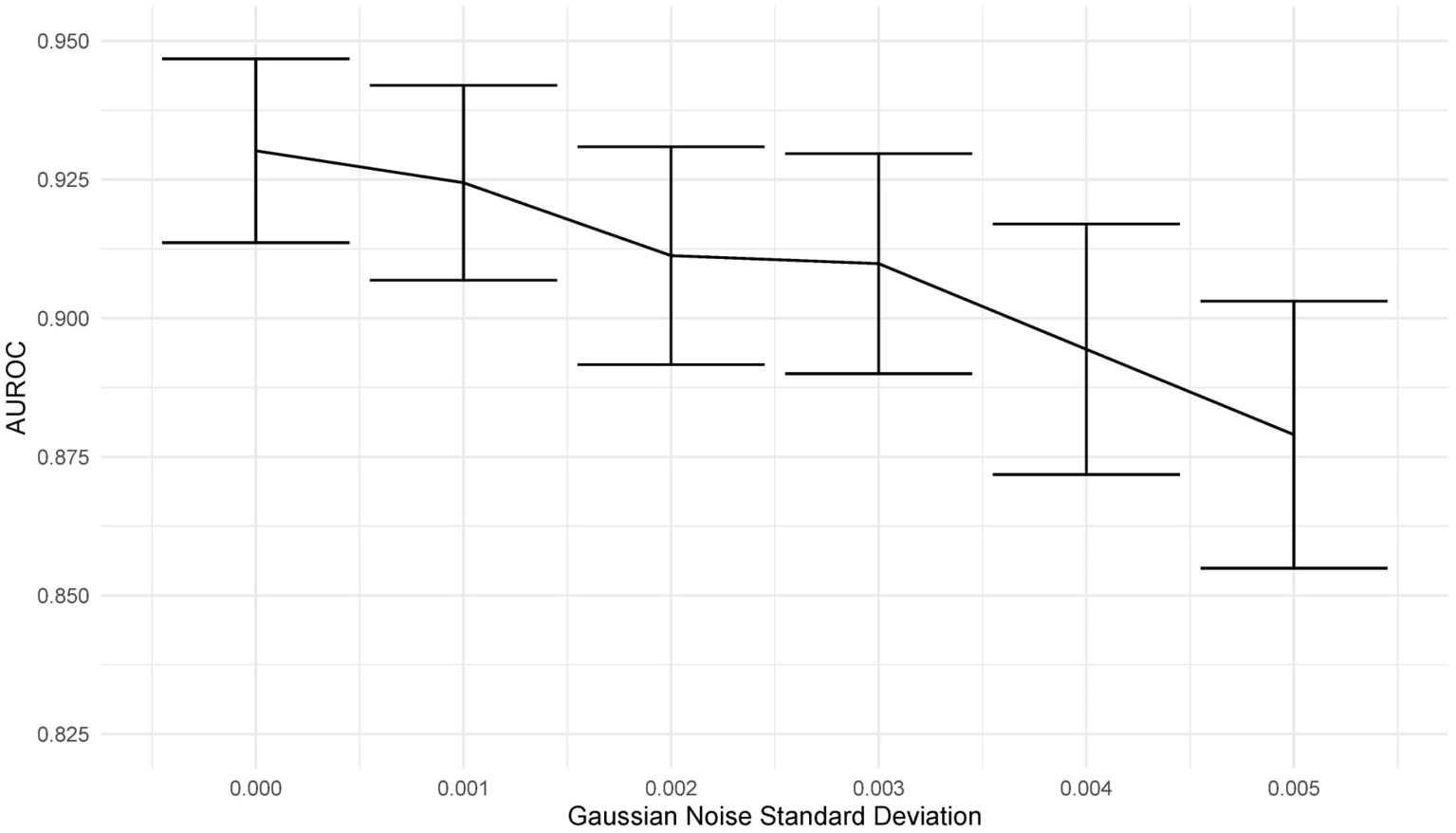 Firstly, the discriminative performance is assessed using AUROC using the pROC package in R (30), with confidence intervals constructed using DeLong’s (31) method. For sensitivity, specificity, positive predictive value (PPV), and negative predictive value (NPV), we use the epiR (32) package in R (30); with 95% confidence intervals constructed using Jeffrey’s prior (33). We report performance at a range of probability thresholds to demonstrate how the thresholds can be adjusted to reduce false positives or false negatives depending on the setting (34). Secondly, we assess model calibration using calibration curves created using the CalibrationCurves package (29), which is based on the rms (35) package. Finally, we assess the clinical usefulness of the model using decision curve analysis (36). Net benefits are given at various thresholds, and models which reach zero net benefit at higher thresholds are considered more clinically useful. Two brief sensitivity analyses are performed, one assessing the model’s ability to deal with missing data and the other assessing its ability to deal with noise. To improve the model’s interpretability and reduce the black-box nature, we produce saliency maps (37) that show which areas of the image are helpful to the model in the prediction. We also check the assumption of normally distributed random-effects parameters.
