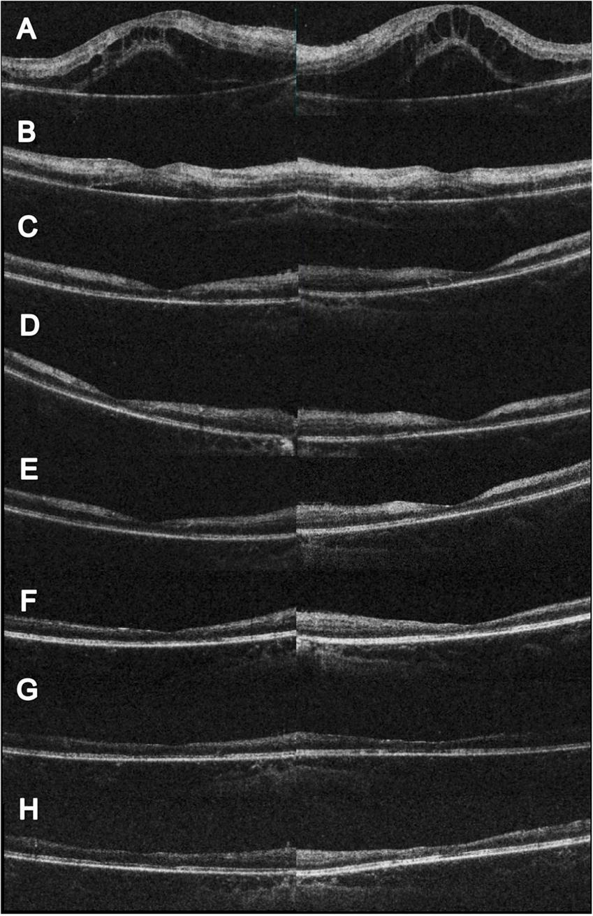 Serial changes in OCT. (A) Initial OCT showed profound macular edema with combine intraretinal and subretinal fluid. (B) Two weeks after initial visit, partial resolution of the macular edema; however, hyperreflective change could be noted at the inner and middle retinal layers. The visual acuity was 0.1 (right) and 0.05 (left). (C) Eleven weeks after initial visit, complete resolution of the macular edema. CFT 156 μm (right) and 147 μm (left). The visual acuity was 0.05 (right) and counting finger 30 cm (left). (D) Seventeen weeks after initial visit and 4 weeks following HBOT. Slightly reduce hyperreflectivity at the left eye could be noted. The visual acuity was 0.1 (both). (E) Twenty-one weeks after initial visit and 8 weeks following HBOT. Extensive retinal thinning with ellipsoid zone loss was noted. The visual acuity was 0.16 (both). (F) Twenty-eight weeks after initial visit and 15 weeks following HBOT. Reduced inner retinal thinning was noted. The visual acuity was 0.16 (right) and 0.2 (left). (G) Forty-three weeks after initial visit and 30 weeks following HBOT. Reduced inner retinal thinning was noted. The visual acuity was 0.05 (right) and 0.16 (left). (H) Sixty weeks after initial visit and 47 weeks following HBOT. Reduced inner retinal thinning was noted. The visual acuity was 0.1 (right) and 0.16 (left).