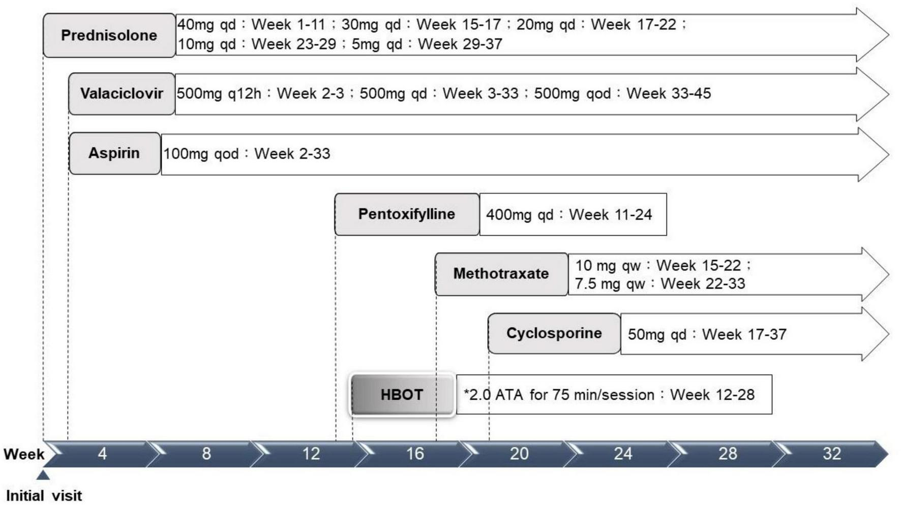 Treatment timeline. ATA, atmosphere absolute; HBOT, hyperbaric oxygen therapy; qd, every day; q12h, every 12 hours; qod, every other day; qw, every week. *Treatment protocol: 2.0 ATA for 75 min per session, 1 session per day, 5 days per week.