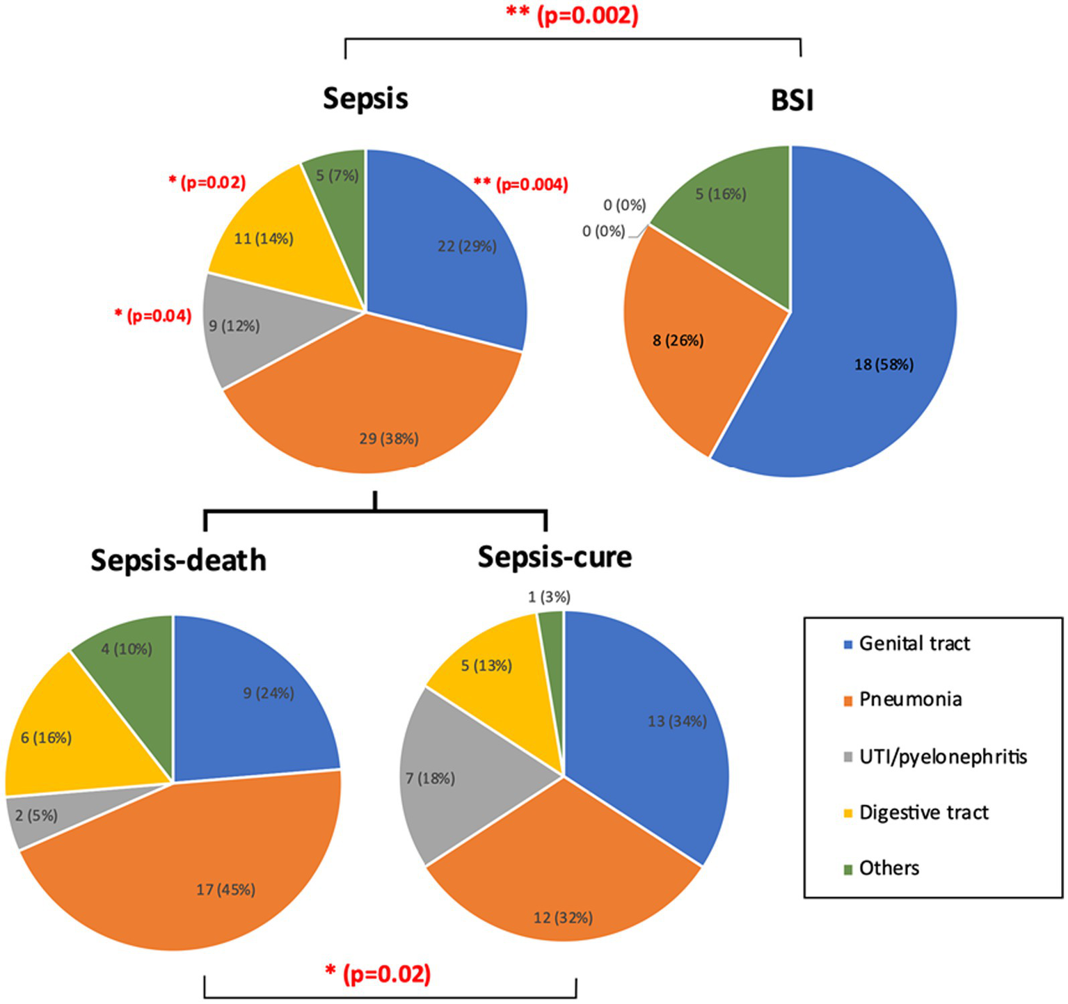 The infection sources were significantly different between the sepsis and BSI groups, as well as between the sepsis-cure and sepsis-death groups. UTI/pyelonephritis and digestive infection showed significantly higher frequency in sepsis patients than in BSI patients, while significantly more genital tract infection cases were shown in BSI patients. Pneumonia may be a risk factor for death in sepsis patients. The case number and ratio are labeled in the figure. p-values with significant changes are marked as red text. The types of diseases included in each group are presented in Supplementary Table S1.