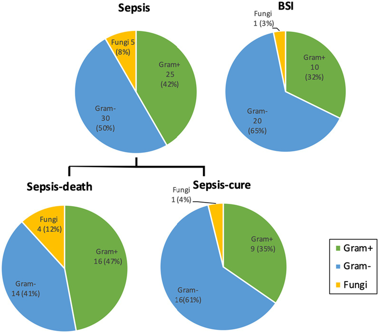 The percentages of gram-positive bacteria and fungi cultured from sepsis patients were both higher than those from the BSI group and higher from the sepsis-death group than from the sepsis-cure group. Microorganism numbers and ratios were labeled. No significant difference was detected between the groups. Detailed information on the cultivated microorganisms is presented in Supplementary Table S2.