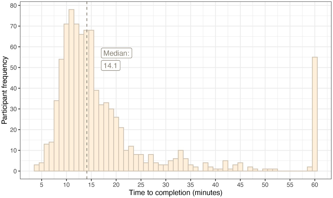 The median time to complete the survey was 14.1 minutes. Fifty-five participants took more than 1 hour, and it was assumed that these participants left the survey window open and returned to it at another time. These outliers were included in the median but were winsorized for the production of Figure 4 which demonstrates the distribution of response time.