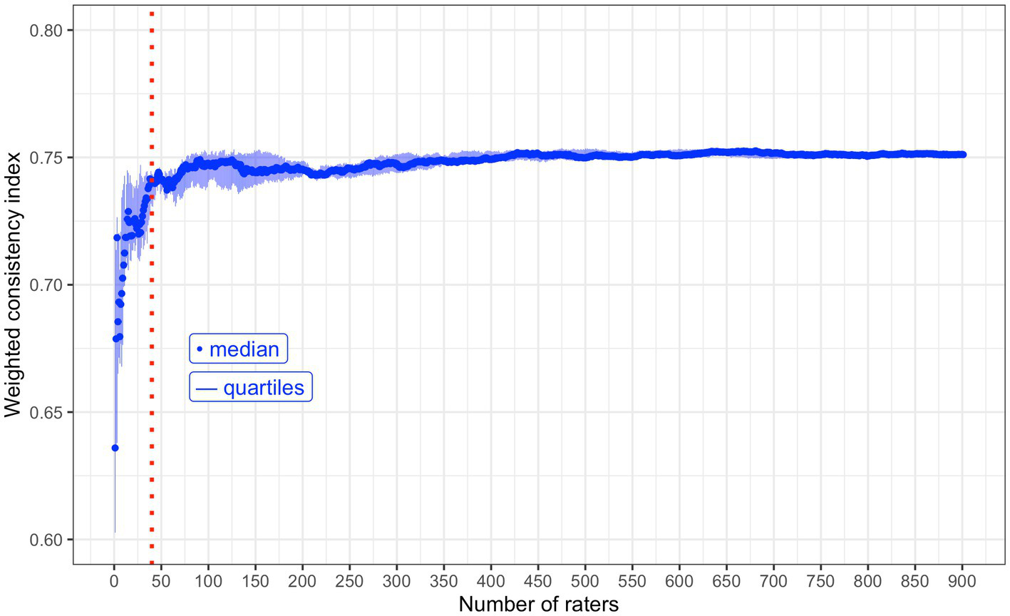 The accuracy of the weighted consistency index is expected to increase with the number of raters (19). As more raters perform more pairwise comparisons, this generates more input data for the algorithm and provides more information about the perspectives of the group. The weighted consistency index is also expected to plateau; beyond a point adding data from more raters will not improve the consistency index, or stabilise the preparedness characteristics’ rankings according to n.mElo ratings. Tracking the consistency index with increasing rater numbers can therefore be used to estimate the number of raters required to produce relatively stable rankings of the preparedness characteristics (19). This is achieved by calculating the weighted consistency index using only a single raters’ pairwise comparison data, then again with an additional rater’s data, and so on until all of the raters are included. Given that the order of rater inclusion could impact the outcomes, this process is repeated ten times with the order of rater inclusion randomised each time. The median weighted consistency index across the ten repeated trials, for each sample size, can be plotted and examined for the point of plateau. The plateau indicates that the consistency indices and rankings of n.mElo ratings are stable and provides evidence for the sample size required.