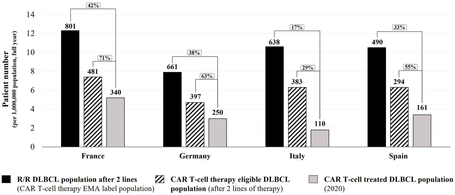 This analysis indicates that in all four EU countries, less than 50% of DLBCL patients matching the EMA label indication received a CAR T-cell therapy in 2020 (Figure 1). Of the estimated CAR T-cell therapy eligible patients, approximately 7 in 10 DLBCL patients in France have been treated with a licensed CAR T-cell therapy in 2020 (71%; 42% of the EMA label population). In Germany and Spain, the CAR T-cell therapy rate was approximately 6 in 10 eligible DLBCL patients (63% and 55% respectively, 38% and 33% of the EMA label population), and in Italy, less than 3 in 10 eligible DLBCL patients received a CAR T-cell therapy in 2020 (29%, 17% of the EMA label population). It should be noted that despite a larger population size in Germany (83.8 million), the German Federal Joint Committee G-BA’s averaged estimations for the number of R/R DLBCL patients after at least two lines of therapy (661) is in range with estimations for Italy (638 patients in 60.5 million inhabitants) and is lower than estimations for France [801 patients in 65.3 million inhabitants; Figure 1; Supplementary Table 2; (12, 17, 18, 20, 41–44)]. As emphasized by the German HTA institute IQWiG in its assessment report, the estimation of R/R DLBCL patients after two lines of therapy in Germany might be underestimated due to data and methodical uncertainties (41); consequently, the rate of DLBCL CAR T-cell therapies in Germany in 2020 might be lower than reported in this analysis. In summary, between 29 and 71% of the estimated medically eligible patients did not receive a licensed CAR T-cell therapy in 2020, despite promising long-term efficacy and survival data (45–47). Reasons for this shortfall might include use of alternative therapies or clinical trial enrollment, restrictive funding criteria applied (e.g., CAR T-cell therapy not funded for DLBCL patients above a maximum age of 70 in Italy (increased to 75 years in May 2022) (23–25).