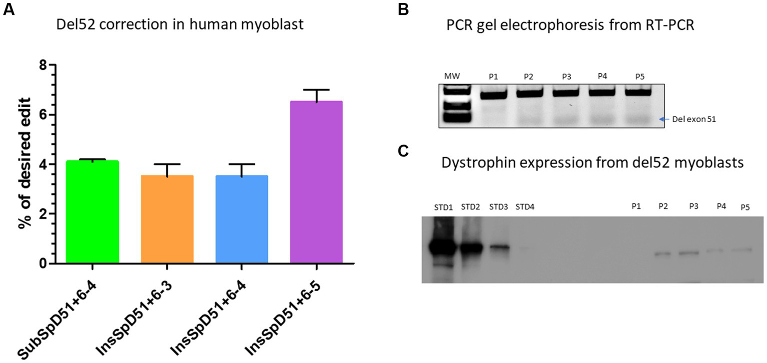 Figure 5. Correction of Del52 mutation in myoblasts. (A) Represents the Prime editing results of the correction of patient myoblasts carrying Del52 mutation using selected pegRNAs from previous experiments in HEK293T cells. (B) Represents the gel electrophoresis results from the PCR of RT-PCR samples. P1, P2, P3, P4, and P5 represent, respectively, the negative control (untreated Del52 patient myoblasts), SubSpD51+6–4, InsSpD51+6–3, InsSpD51+6–4, and InsSpD51+6–5. The lower size bands confirm the exon 51 skipping. (C) Represents the western blot result for the correction of Del52 in patient myoblasts. STD1, STD2, STD3, and STD4 represent the positive control standard bands(untreated healthy myoblasts), P1, P2, P3, P4, and P5 represent, respectively, the negative control (untreated Del52 patient myoblast), SubSpD51+6–4, InsSpD51+6–3, InsSpD51+6–4, and InsSpD51+6–5.