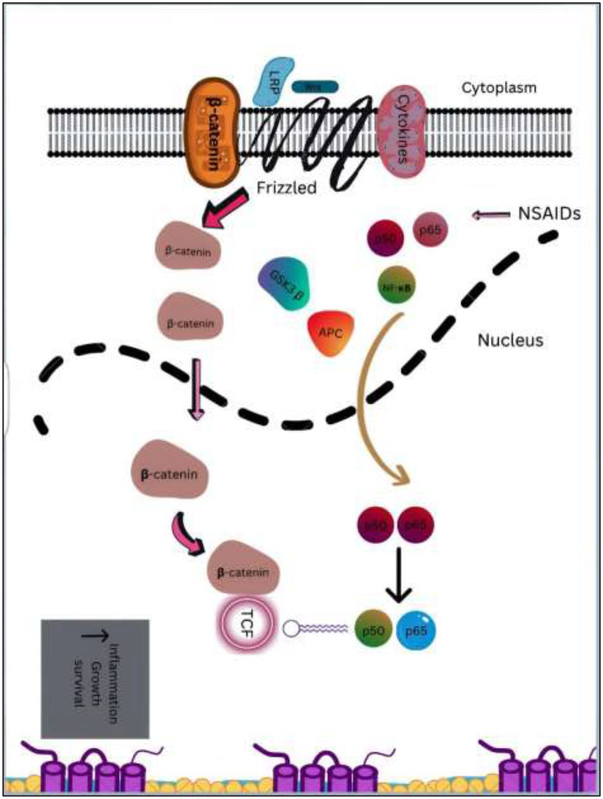 Cyclooxygenase (COX)-dependent and independent pathways participate in anti-tumorigenesis, albeit their mechanisms are not completely known (86). The primary anticancer action of NSAIDs is assumed to be a COX-2 inhibition-mediated suppression of prostaglandin E2 production, which reduces tumor cell proliferation, angiogenesis, and enhances apoptosis. Various signal transduction pathways like nuclear factor-kappa B, NF-κB, have been proven as COX-independent NSAID-induced effects, despite the fact that many of the anticancer mechanisms of NSAIDs are described as COX-dependent. Numerous studies have been conducted on the relationship between expression of COX and colorectal cancer, including prognostic variables and potential chemo-preventive drugs (87).