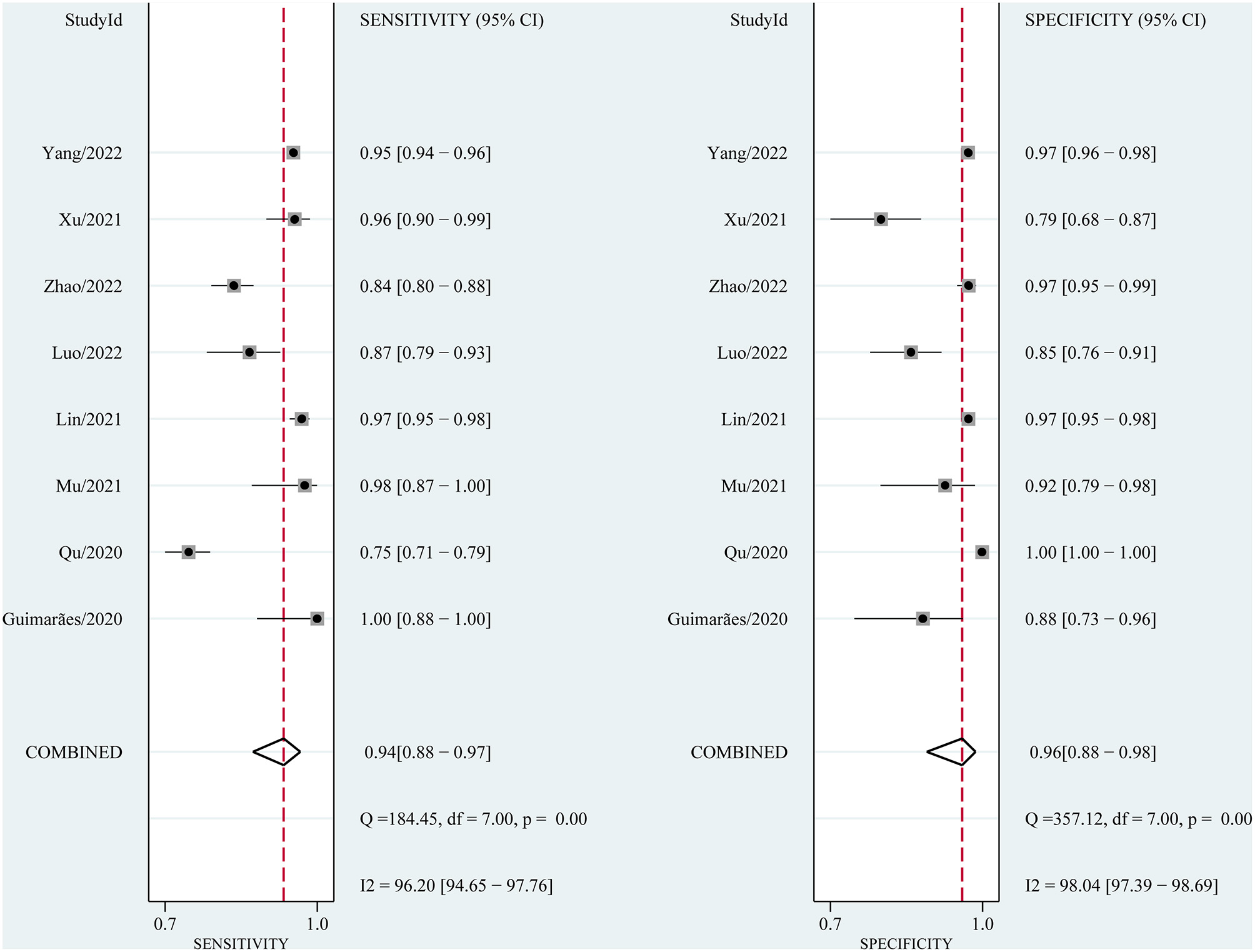 We performed a pooled analysis of the eight included studies to assess the overall performance of AI in the endoscopic-assisted diagnosis of CAG. As shown in Figure 4, the pooled sensitivity and specificity were 94% (95% CI: 0.88–0.97, I2 = 96.2%) and 96% (95% CI: 0.88–0.98, I2 = 98.04%), respectively, both of which showed significant heterogeneity. The pooled PLR, NLR, and DOR were 21.58 (95% CI: 7.91–58.85, I2 = 96.23%), 0.07 (95% CI: 0.04–0.13, I2 = 95.95%, Supplementary Figure S1), and 320.19 (95% CI: 128.5–797.84, I2 = 100%, Supplementary Figure S2), respectively. The PLR greater than 10 indicated that AI could confirm the diagnosis of CAG. The NLR less than 0.1 indicated that AI could effectively exclude CAG. The DOR is significantly greater than 1, which indicates that AI has a good discrimination of CAG.