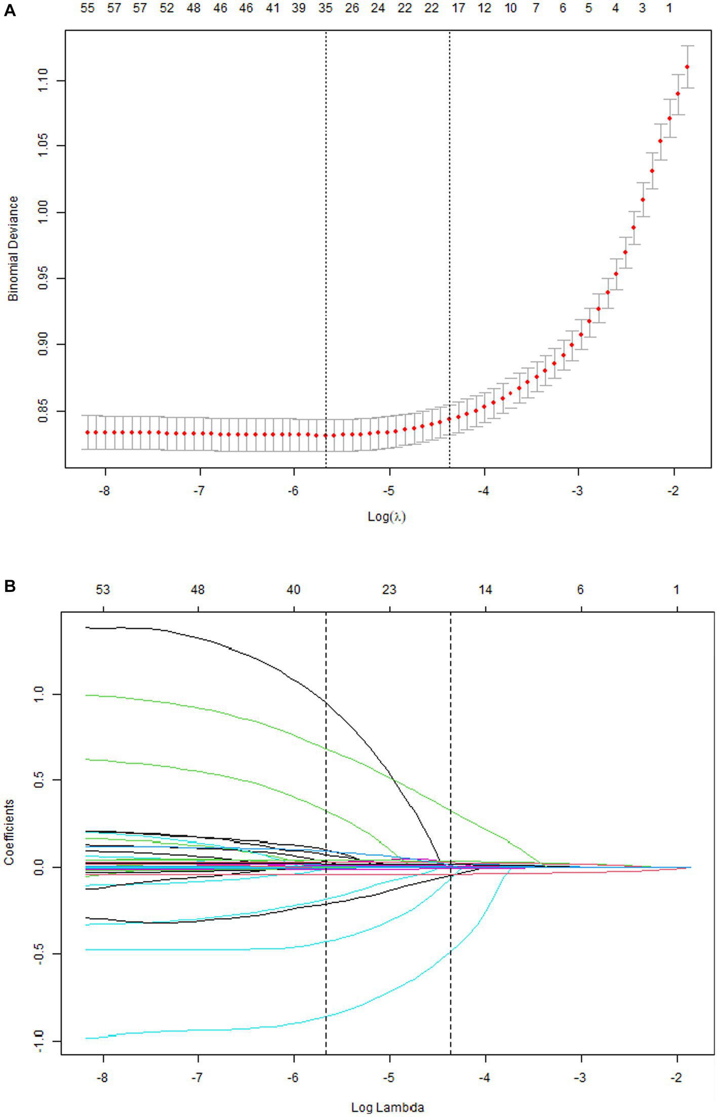 Least absolute shrinkage and selection operator (LASSO) regression analysis was applied to identify factors related to the mortality of patients with COVID-19. The Lambda values were chosen after a 10-fold cross-validation. Subsequently, a multivariate logistic regression analysis was established with the selection of LASSO regression analysis, in which p-value levels for inclusion criteria were conducted as 0.05.