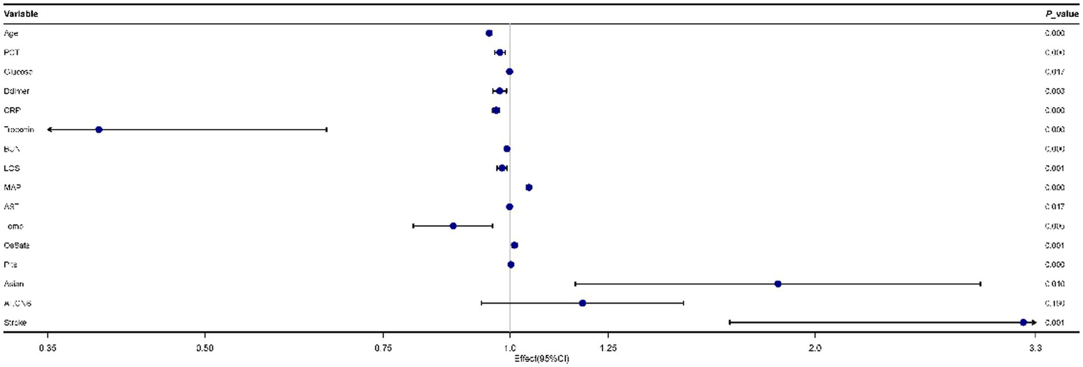 COVID-19 can affect multisystem organs, and the main clinical presentation is pneumonia (3). Although most patients with COVID-19 have mild to moderate illness, with common respiratory symptoms and a good prognosis, several severe and critical patients will get worse rapidly with acute respiratory distress syndrome (ARDS), septic shock, multiple organ dysfunction, and even death, especially in those of the elderly with comorbidities such as congestive heart failure (CHF), chronic obstructive pulmonary disease (COPD), central nervous system (CNS) disease, chronic renal failure, and cancer (4). Furthermore, as previously described, deaths were more common in older patients with abnormal laboratory indexes such as inflammatory factors and hepatorenal function after COVID-19 affected (5). Therefore, it is crucial and urgent to rapidly identify prognostic indicators of fatal outcomes through efficient predictive methods to aid in the early implementation of preventive measures and interventions, thereby preventing disease progression and mortality in critically ill patients. The accurate and immediate decision-making of treatment strategies may reduce the mortality risk.