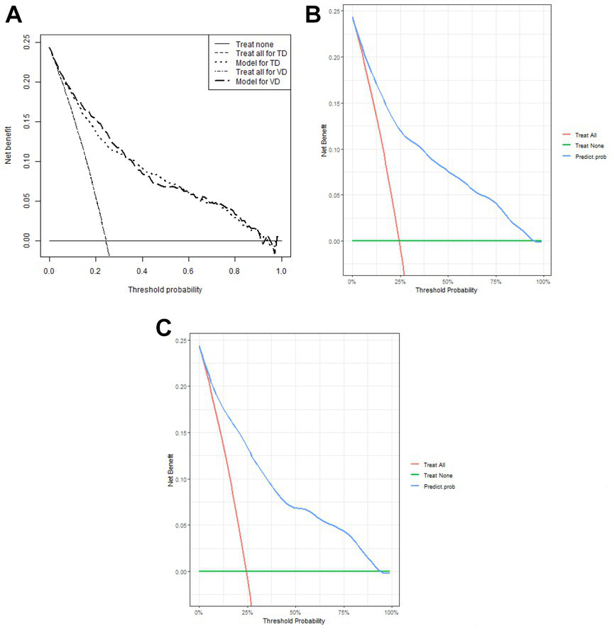 Regarding its clinical usefulness, the decision curve analysis (DCA) was undertaken to assess the clinical benefit of the nomogram. Detailed descriptions of DCA have been previously reported (12). The results were considered statistically significant at p-value <0.05.