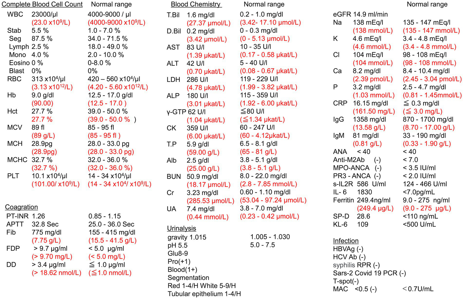 Laboratory data. WBC, white blood cell; RBC, red blood cell; PLT, platelet; PT-INR, prothrombin time/international normalized ratio; APTT, partial thromboplastin time; Fib, fibrin; FDP, fibrin/fibrinogen degradation products; DD, Ddimer; T-Bil, total bilirubin; D-Bil, direct bilirubin; AST, aspartate aminotransferase; ALT, alanine aminotransferase; γ-GTP, glutamyl transpeptidase; ALP, alkaline phosphatase; LDH, lactate dehydrogenase; CK, creatine kinase; T.P, total protein; Alb, albumin; BUN, blood urea nitrogen; Cr, creatinine; UA, urine acid; eGFR, estimated glomerular filtration rate; Na, sodium; K, potassium; Cl, chloride; Ca, calcium; NH3; ammonia; CRP, C-reactive protein; IgG, immunoglobulin G; IgM, immunoglobulin M; ANA, anti-nuclear antibody; Anti-AMA M2Ab, anti-mitochondrial M2 antibody; MPO-ANCA, myeloperoxidase perinuclear antineutrophil antibody; PR3-ANCA, proteinase 3 cytoplasmic antineutrophil antibody; Soluble IL2R, soluble interleukin-2 receptor; IL-6, interleukin-6; HBV Ag, hepatitis B antigen; HCV Ab; hepatitis C Ab; T-spot, T-spot TB; MAC, Mycobacterium avium-intracellulare complex; RPR, syphilis rapid plasma regain; SP-D, surfactant protein D; KL-6, Krebs von den Lungen 6. SI unit is shown in red.
