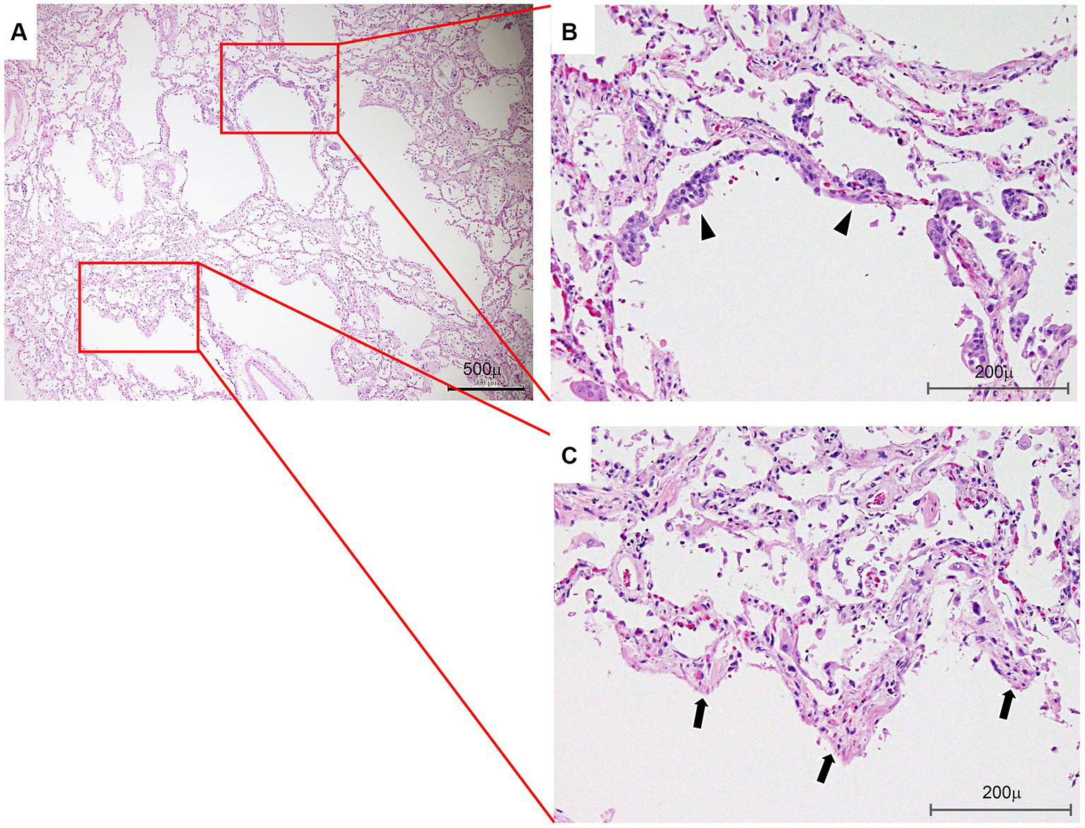 Lung histology. (A) Photomicrograph showing an area of associated diffuse alveolar damage at a lower magnification. Bar: 500 μm. (B) Photograph showing squamous metaplasia of bronchiolar epithelium (arrowheads). Bar: 200 μm. (C) Note hyaline membranes lining the alveolar ducts (arrows) and partially collapsed adjacent alveoli (hematoxylin and eosin staining) (arrows). Bar: 200 μm.