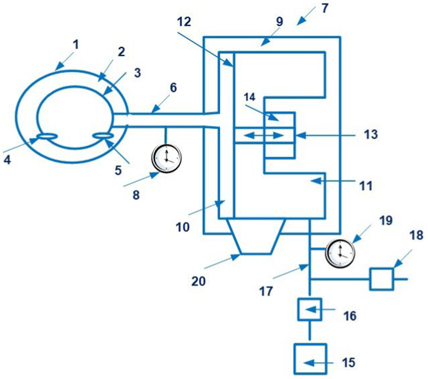 A schematic view of a Finapres device for controlling the pressure in the finger cuff (1 – finger cuff; 2 – outer sleeve; 3 – the inflatable bladder; 4 – an infrared LED; 5 – an infra-red sensor; 6 – a line; 7 – a device for controlling the pressure in the bladder; 8 – a pressure sensor; 9 – the housing; 10, 11 – chambers; 12 – the membrane; 13 – a rod; 14 – a coil; 15 – an air pump; 16 – a valve; 17 – a line; 18 – an exhaust valve; 19 – a pressure sensor; 20 – a bypass channel). Diagram modified from reference (43).