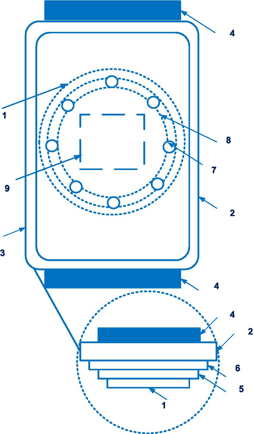 The cuff of the VitalStream (1 – the hook section, 2 – the loop section, 3 – the substrate member, 4 – an inflatable membrane, 5 – the periphery of the membrane, 6, 7 – edges, 8 – interior region, 9 – tube). Diagram modified from reference (45).