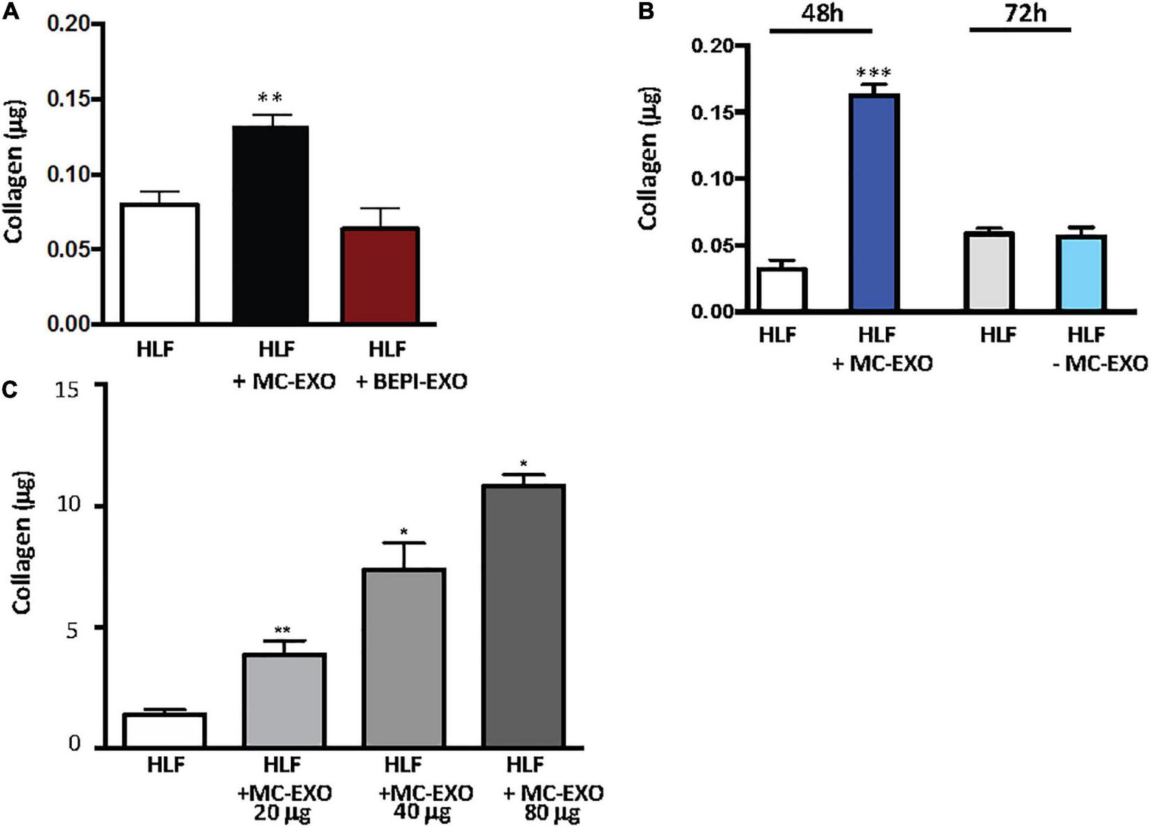 The effect of MC-EXO on HLF collagen secretion is also dose-dependent (Figure 2C.) The more MC-EXO are available for uptake in the media the greater the collagen production by the HLF; a doubling of the amount of MC-EXO available for uptake yields a significant increase in collagen secretion. These results suggest that there is a direct effect of the amount of MC-EXO available for uptake by HLF with abundance of secreted collagen.
