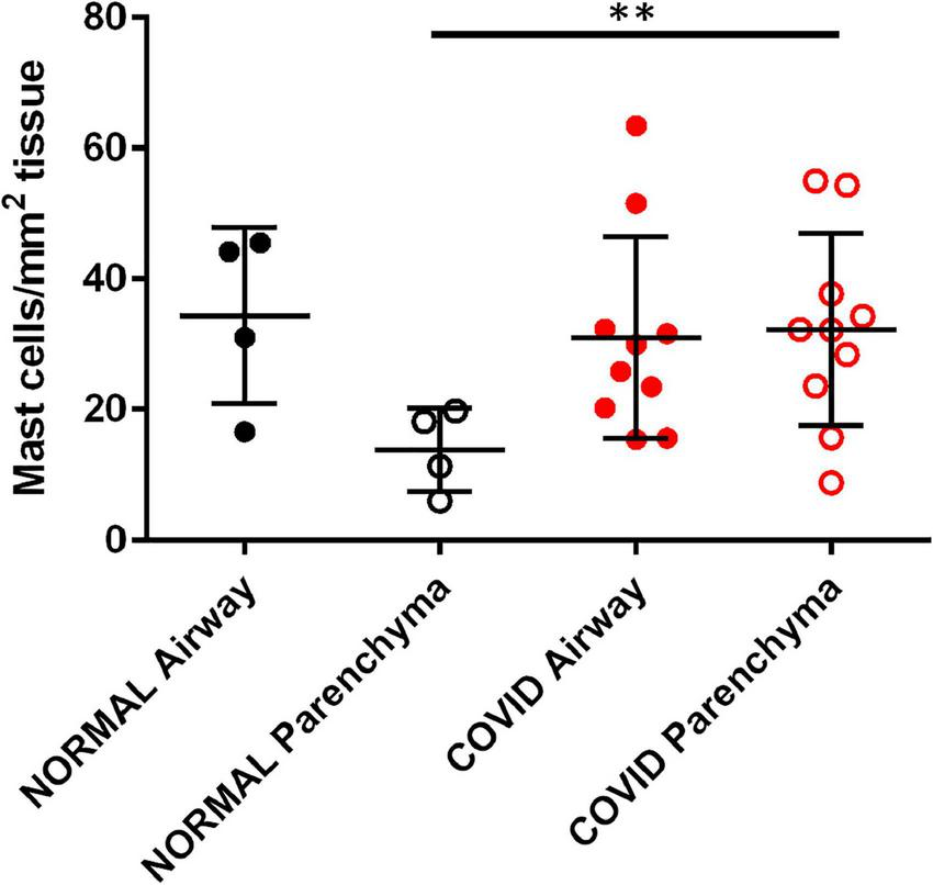 Figure 5. SARS-Cov-2 infection increases lung parenchymal mast cells. Cadaveric lungs from patients infected with SARS-CoV-2 (n = 10) or biopsies from donor lungs tissue prior to transplant (n = 4) were stained with the mast cell marker avidin HRP. Mast cells were quantified in parenchyma and airway walls (medium sized airways, 0.5–5.0 mm) **P < 0.01 SARS-Cov-2 parenchyma versus normal parenchyma.