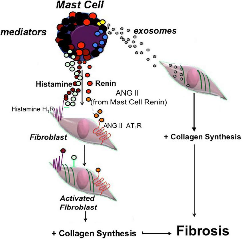 Figure 6. Cartoon depicting two parallel pathways in mast cells leading to fibroblast activation and excess collagen production. One pathway depicts classic mast cell degranulation with release of pro-fibrotic mediators like histamine and renin (ANG II), acting on the resident receptors on fibroblasts that activate the collagen synthesis pathway. The other pathway is the newly identified exosome pathway where shed exosomes are taken up in the cytosol of fibroblasts leading to proline hydroxylation and increased collagen production.