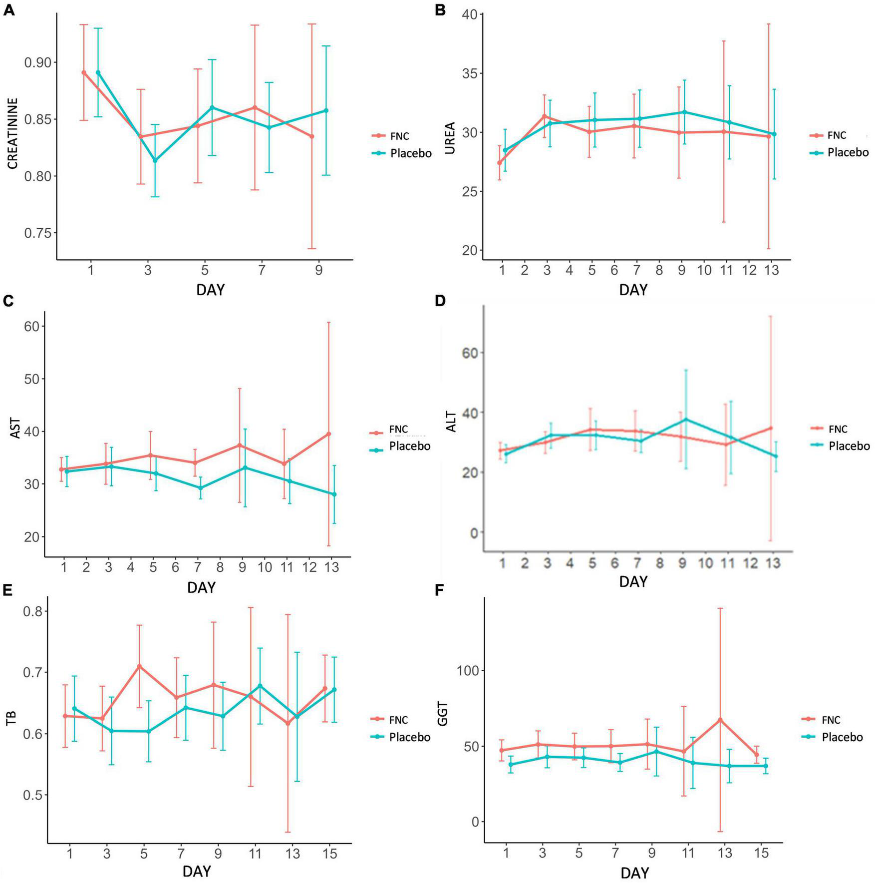 Viral load analysis measured by RT-PCR (A) and DDPCR (B) of all participants in the FNC group and the placebo group. Data are median (SD) (Red line: FNC; Blue line: PLACEBO).