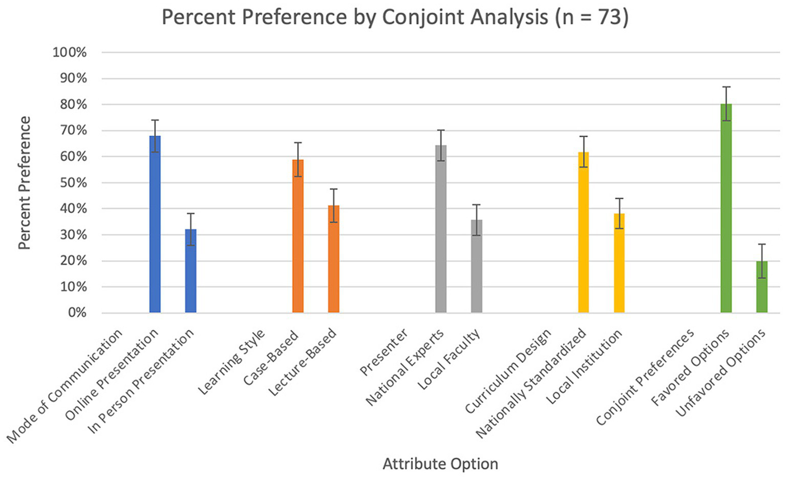 Seventy-three trainees completed the conjoint analysis exercise. Mode of communication was rated as significantly more important than curriculum design (relative importance 28.6% vs. 19.9%). Overall, the majority preferred online/virtual presentations to in-person presentations. Respondents preferred national experts to faculty members from their local institutions, and preferred cased based lectures to didactics style lectures. A nationally standardized curriculum was also preferred over curriculum designed by local institutions. Finally, when segmented by level of training, there was increased preference for overall favored options as PGY year increased.