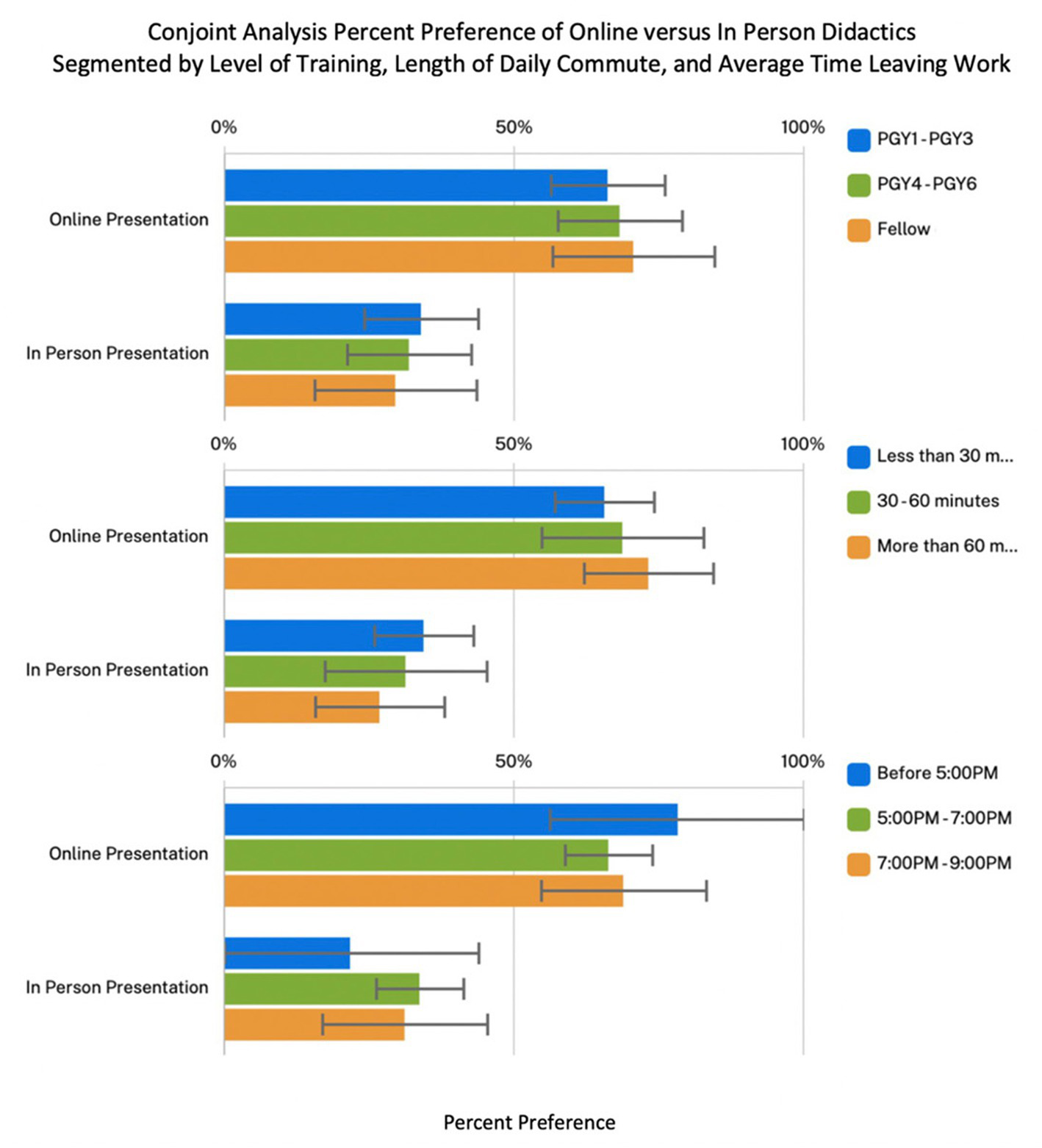 Conjoint analysis of percent preference between online lectures versus in person lectures as segmented by level of training, length of commute from work, and average hour leaving work. Error bars are 95% CI based on the conjoint analysis.