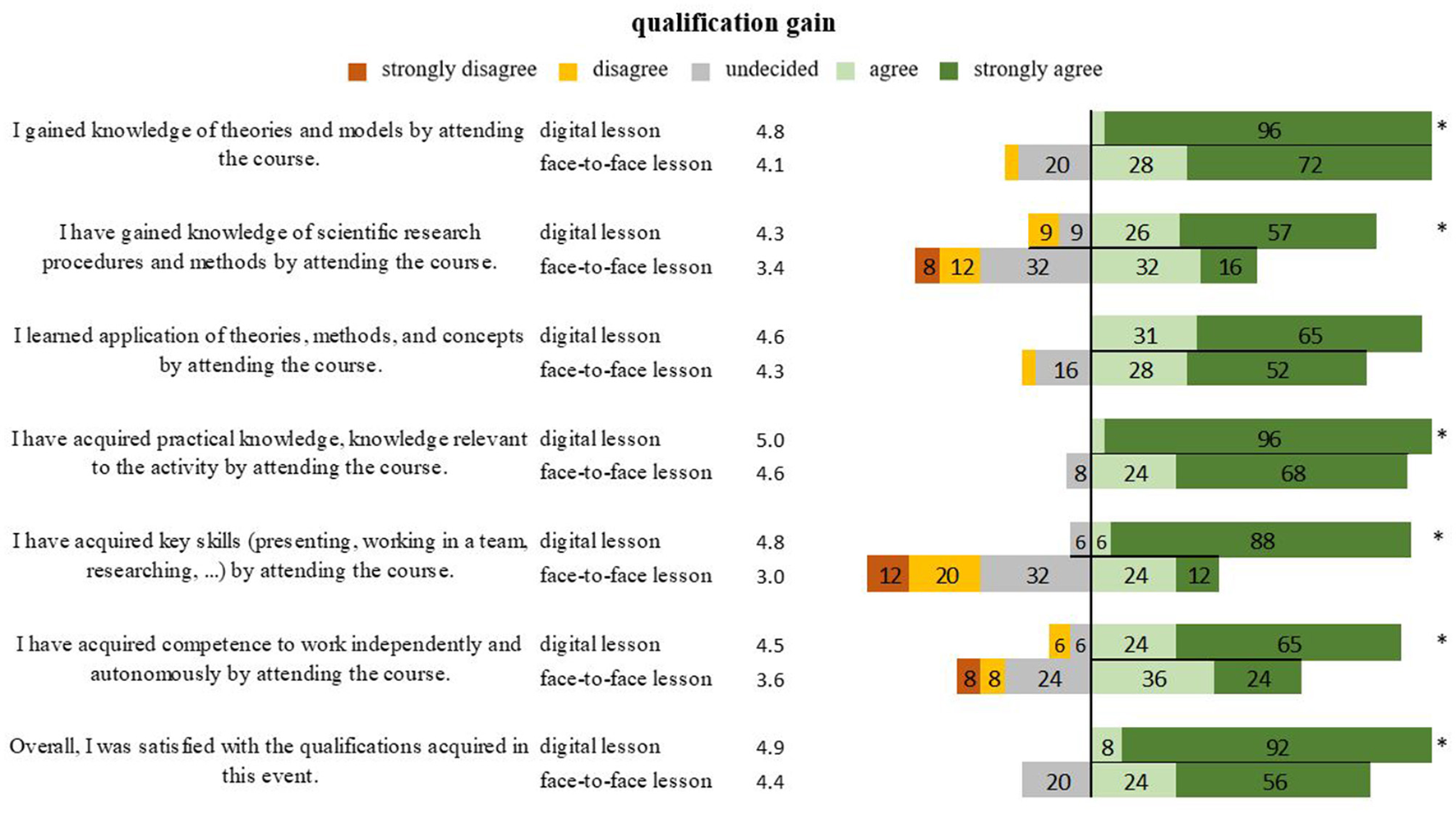 The overall satisfaction with the course (4.9 vs. 4.4; P = 0.013) and the gain in skills (4.9 vs. 4.4; P = 0.005), and the satisfaction with the instructors (5.0 vs. 4.7; P = 0.026) were predominant for digital teaching. The overall satisfaction with the participants was equally evaluated for both forms (4.7 vs. 4.6; P = 0.596).