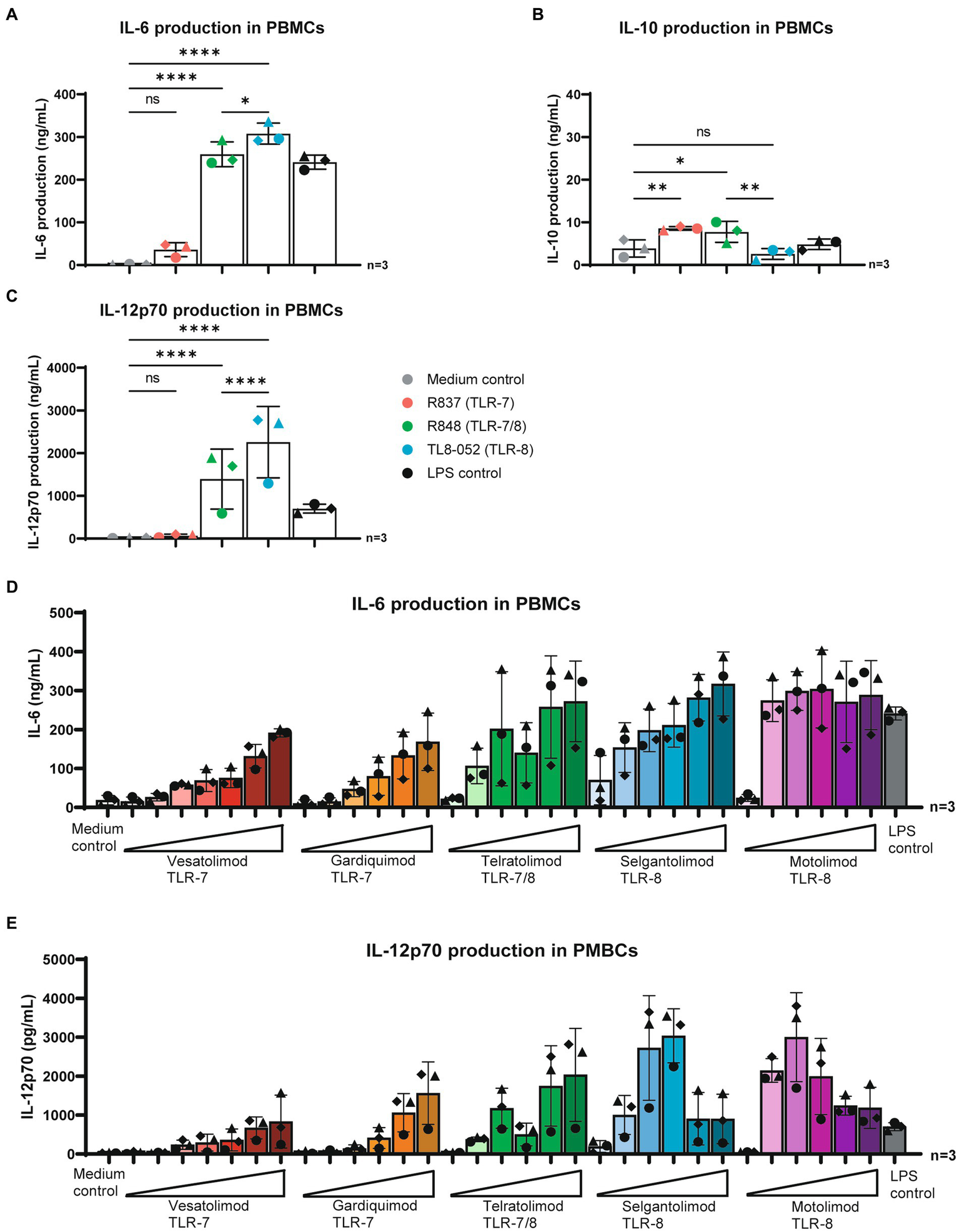 TLR-7 and TLR-8 agonists induced immune activation in PBMCs. (A–C) PBMCs were stimulated for 24 h in the presence of different TLR agonists. Supernatant was harvested after 24 h stimulation, secretion of IL-6, IL-10 and IL-12p70 proteins were measured by ELISA as described by the manufacturer (eBiosciences). OD450nm values were measured using BioTek synergy HT. (D,E) PBMCs stimulated for 24 h in the presence various TLR-agonist in varying concentrations. Supernatant was harvested after 24 h stimulation. Secretion of IL-6 and IL-12p70 proteins were measured by ELISA as described by the manufacturer (eBiosciences). OD450nm values were measured using BioTek synergy HT. Obtained values were normalized to values obtained from LPS stimulation to allow for better comparison between donors. Two-way ANOVA tests were perfomed to compare unpaired grouped data between donors (IL-6, IL-10, IL-12p70 Elisa). Statistical analysis of obtained data was performed using Graphpad Prism 9 (Graphpad Software Inc). Statistical significance was set at ns p > 0.05, *p < 0.05, **p < 0.01, ***p < 0.001, ****p < 0.0001.