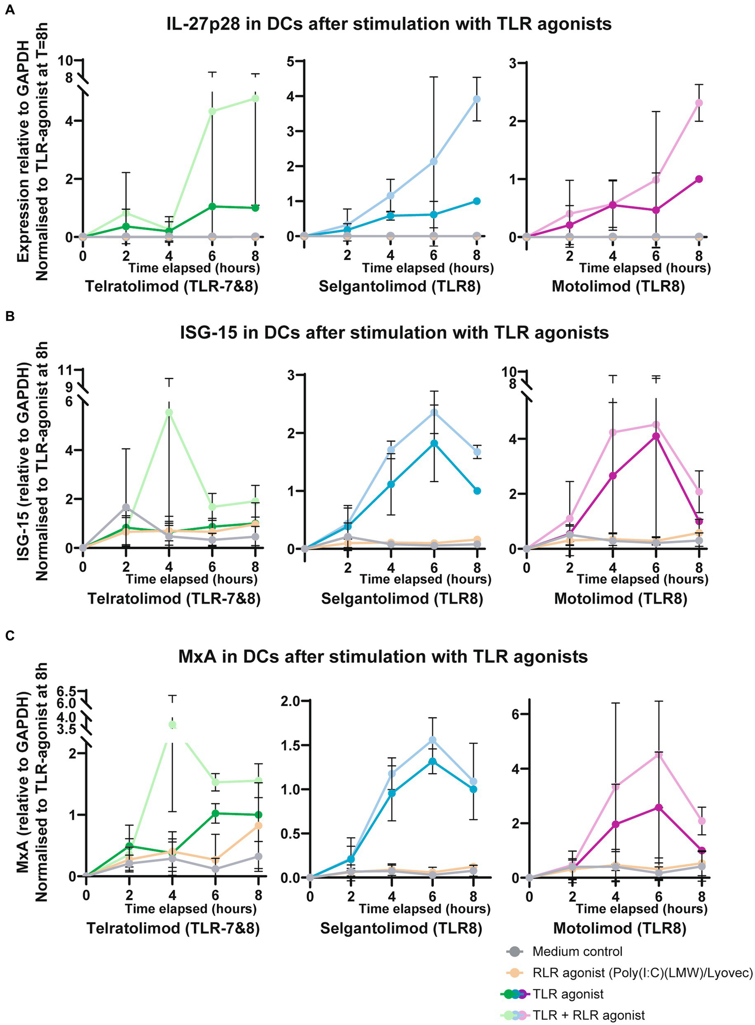 Moreover, ISG15 mRNA expression was enhanced when Selgantolimod and Motolimod were combined with RLR agonist Poly(I:C) (LMW)/Lyovec compared to stimulation with the agonists alone, with a 1,5–2 fold increase in gene expression being observed 8 h after stimulation (Figure 4B).