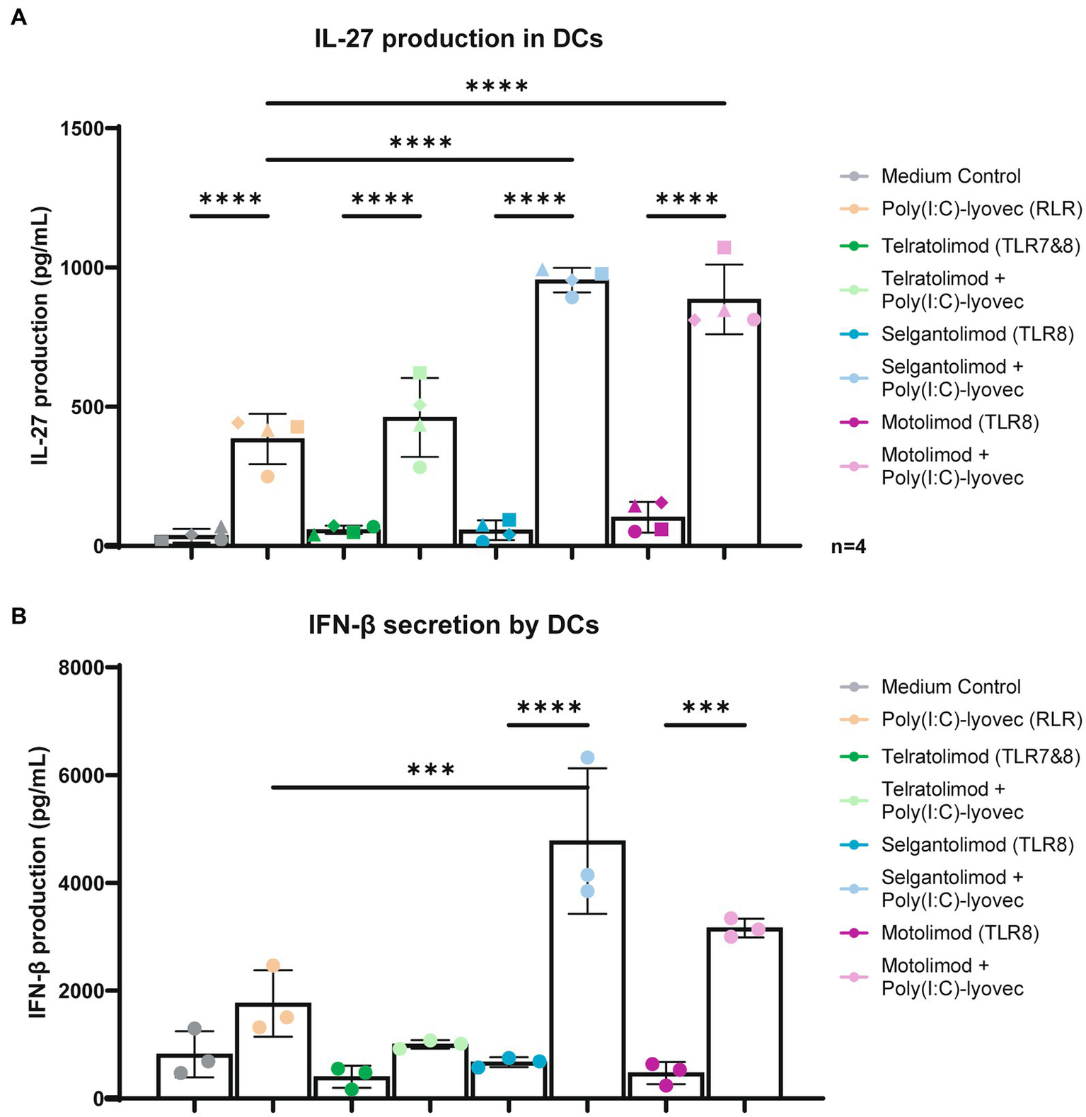 Moreover, crosstalk between the TLR8 agonists and Poly(I:C) (LMW)/Lyovec increased protein secretion IFN-β with a two to nine fold increase compared to the medium control (Figure 5B).