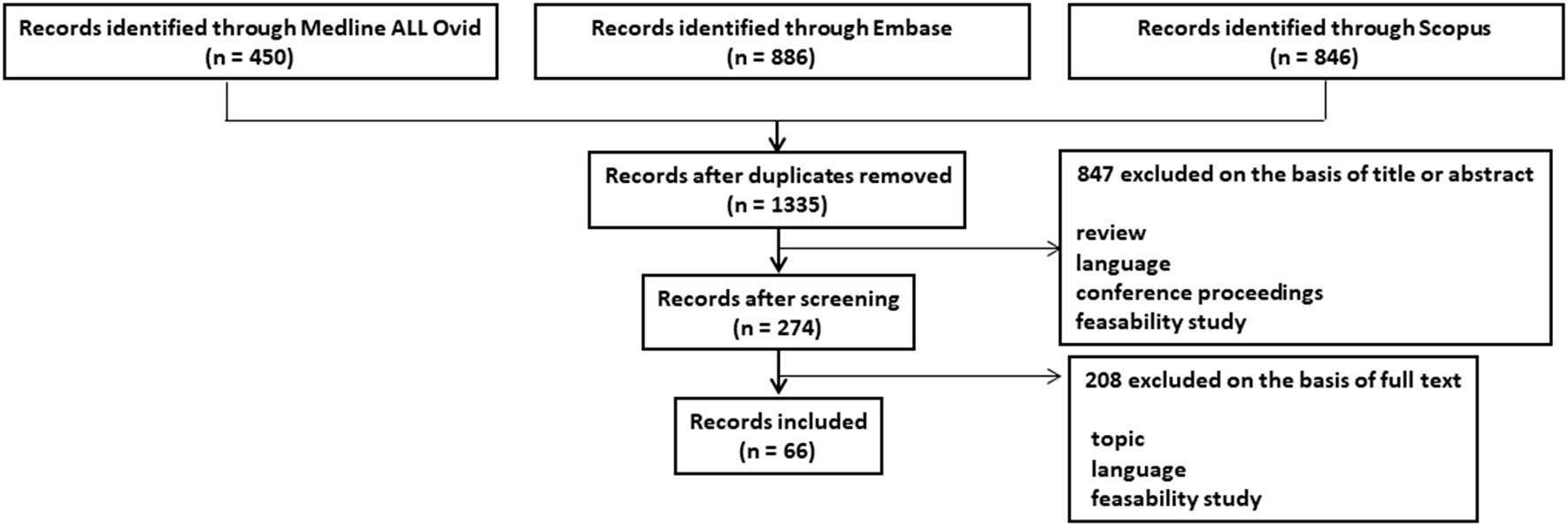 The PRISMA flowchart outlining study selection is shown in Figure 1. An initial search identified 2,182 studies, 1,335 of which remained after the removal of duplicates. All but 274 of these studies were excluded at the stage of abstract review. Furthermore, 208 additional studies were excluded after reviewing the full manuscript. The reasons for exclusion at each stage are detailed in Figure 1. Overall, 66 studies responded to the inclusion criteria and constituted the study data.