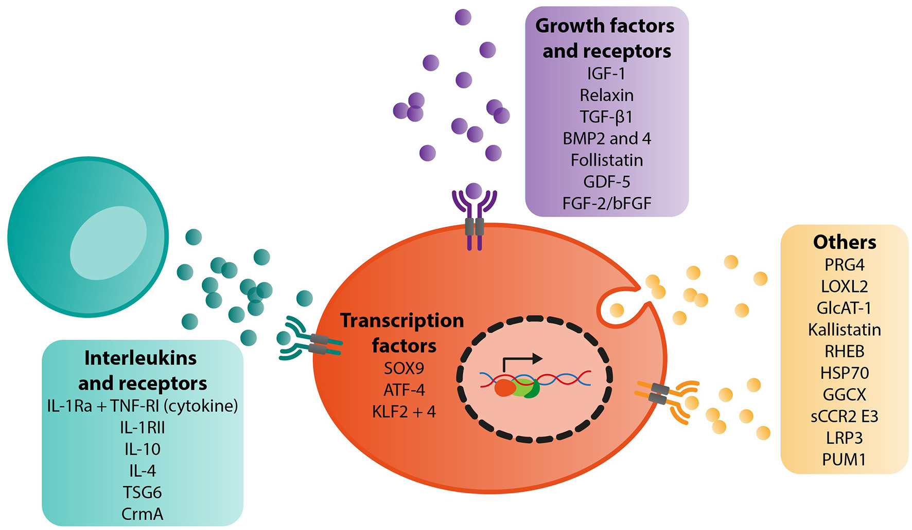 We found a total of 29 different targets for gene therapy in the context of OA. These included studies examining interleukins (IL-1Ra alone or in combination with another target, TNF-RI, IL-1RII, IL-10, IL-4, TSG6, CrmA), growth factors, and receptors (IGF-1, relaxin, TGF-β1, BMP2 and 4, follistatin, GDF-5, FGF-2/bFGF), transcription factors (SOX9 alone or in combination with another target, KLF2 and 4, and ATF-4) and other key targets such as PRG4 (alone or in combination with another target), LOXL2, GlcAT-1, GGCX, kallistatin, RHEB, HSP70, PUM1, sCCR2 E3 and LRP3 (Figure 2).