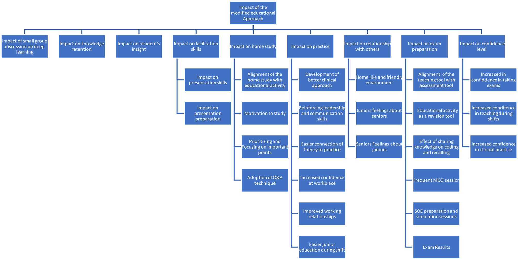 Five main themes were identified and explored and are believed to thoroughly explain the residents' experience with the new educational approach. The main themes generated from our data were the general perception of residents toward the new teaching modes, the learning environment, the impact of the new educational approach, the challenges they encountered, and their general satisfaction level with the new experience. The thematic analysis map is displayed in Figure 1. Table 2 shows an example of referenced codes and themes.