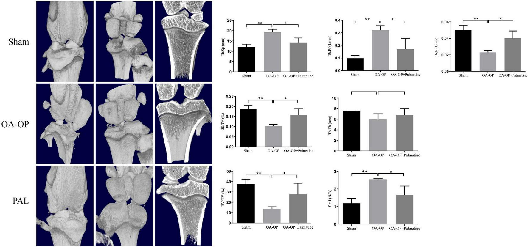 Effect of PAL on bone trabecular morphometric parameters in OA-OP rats. Micro-CT images of the distal femur and proximal tibia 56 days after PAL administration; Tb. N, BV/TV, BS/TV, Tb. Th, Tb. Pf, Tb. Sp, and SMI, 56 days after PAL administration Micro-CT analysis. *Statistically significant difference (P < 0.05). **Statistically significant difference (P < 0.01).