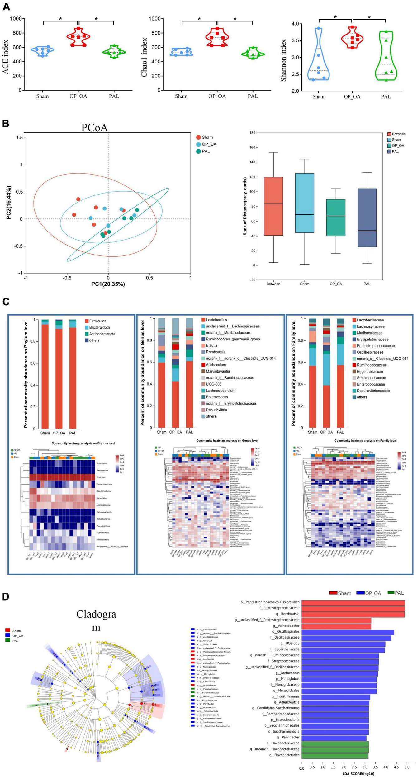 To further study the effect of PAL on intestinal microflora, fecal microflora of 18 samples from 3 groups were analyzed by 16S RNA sequencing. For the α-diversity, there were significant differences in the ACE, Chao1 and Shannon indexes among the three groups (Figure 5A), suggesting that PAL treatment may have a significant effect on the intestinal microflora of OA-OP rats. Using the PCoA method, we analyzed β-diversity. As shown in Figure 5B, PCoA showed a significant clustering of microbiota composition in each group and showed that the microbiota community of rats in the OA-OP group was significantly different from that in the sham and PAL groups, suggesting that PAL treatment may improve OA and OP in rats by regulating GM imbalance. Next, to assess specific changes in GM, the relative abundance of dominant groups was further analyzed (Figure 5C). At the phylum level, Firmicutes, Bacteroidota and Actinobacteriota were predominant. At the genus level, Lactobacillus, unclassified_f_Lachnospiraceae and norank_f_Muribaculaceae were predominant. At the family level, Lactobacillaceae, Lachnospiraceae and Muribaculaceae were predominant. To further explore the differences in intestinal microbiota among the sham, OA-OP and PAL groups, we used LEfSe to identify specific changed bacterial phenotypes at each phylogenetic level. As shown in Figure 5D, p < 0.05 and LDA > 3.0 were biomarkers of significant differences in the screening rank sum test. A total of 27 specific bacteria were divided into 3 groups, including 5 specific bacteria in the sham group, 19 in the OA-OP group and 3 in the PAL group.