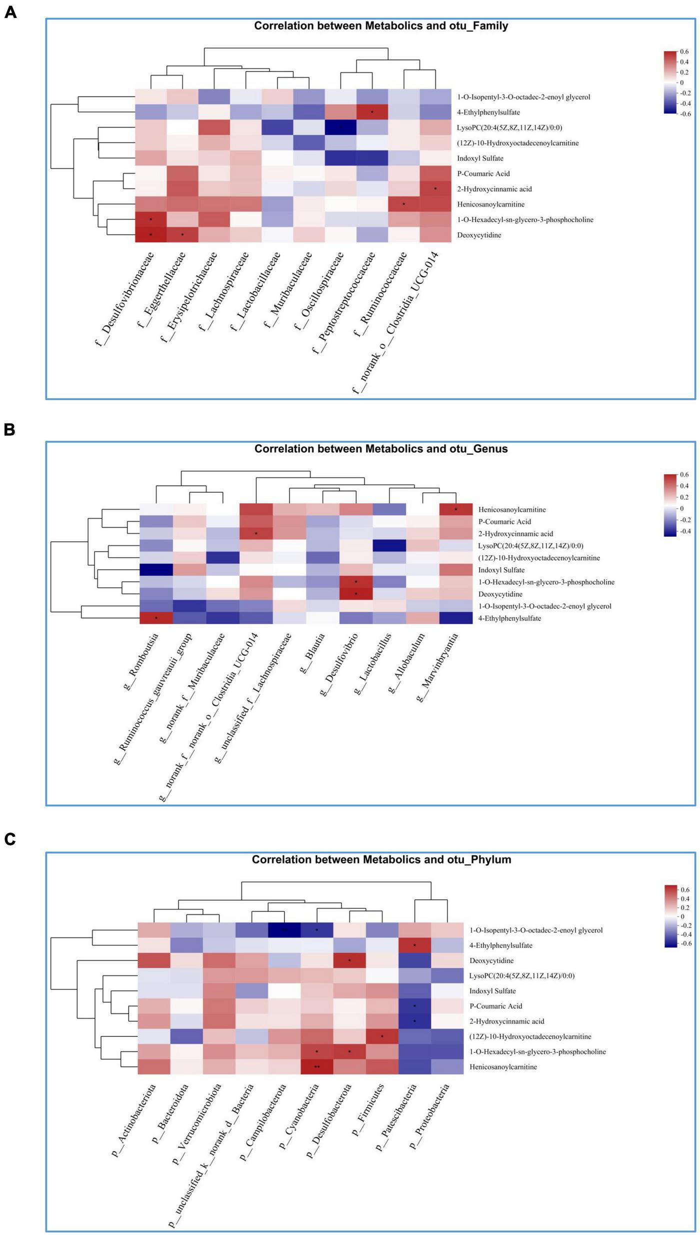 Similarity of microbial communities between samples was determined by principal coordinate analysis (PCOA) based on Bray-curtis dissimilarity, using the vegan v2.5-3 package. Permutation multivariate analysis of variance (Permanova) test was used to assess the percentage of variance explained by treatment of vegan v2.5-3 packages and its statistical significance. According to the LEfSe linear discriminant analysis analysis, there were significantly abundant taxa (phylum genus) in different groups of bacteria (LDA score >2, p < 0.05). Species were selected for correlation network plot analysis according to Spearman correlation | r | > 0.6 p < 0.05.