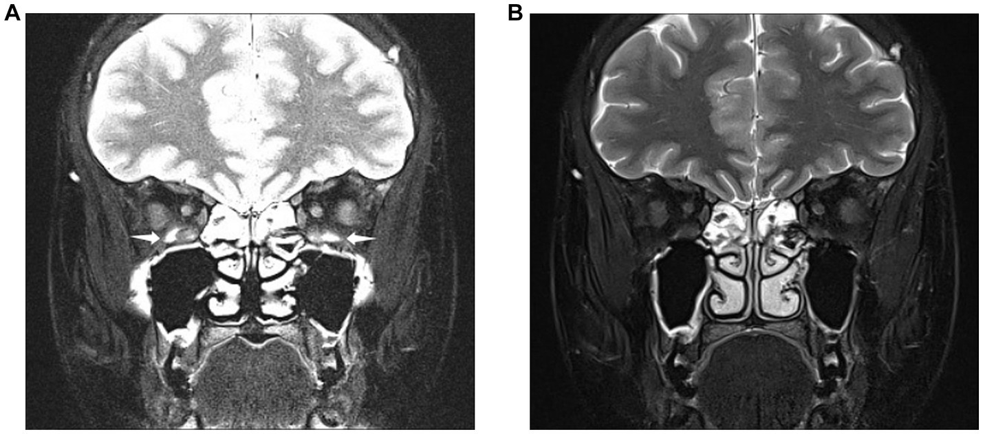 Figure 2. Images obtained from a 28-year-old woman diagnosed with thyroid eye disease. Coronal SPAIR-transverse relaxation (T2)-weighted imaging (T2WI) (A) and water-only Dixon-T2WI (B). The latter image shows a more uniform fat suppression on the orbit and periorbital tissue than the former. Coronal SPAIR-T2WI (A) displaying the major susceptibility artifacts (white arrowheads) involving both inferior rectus muscles, hindering accurate analysis of muscular signal. Coronal water-only Dixon-T2WI (B) displaying the fewer susceptibility artifacts and strong fat-suppression ability.