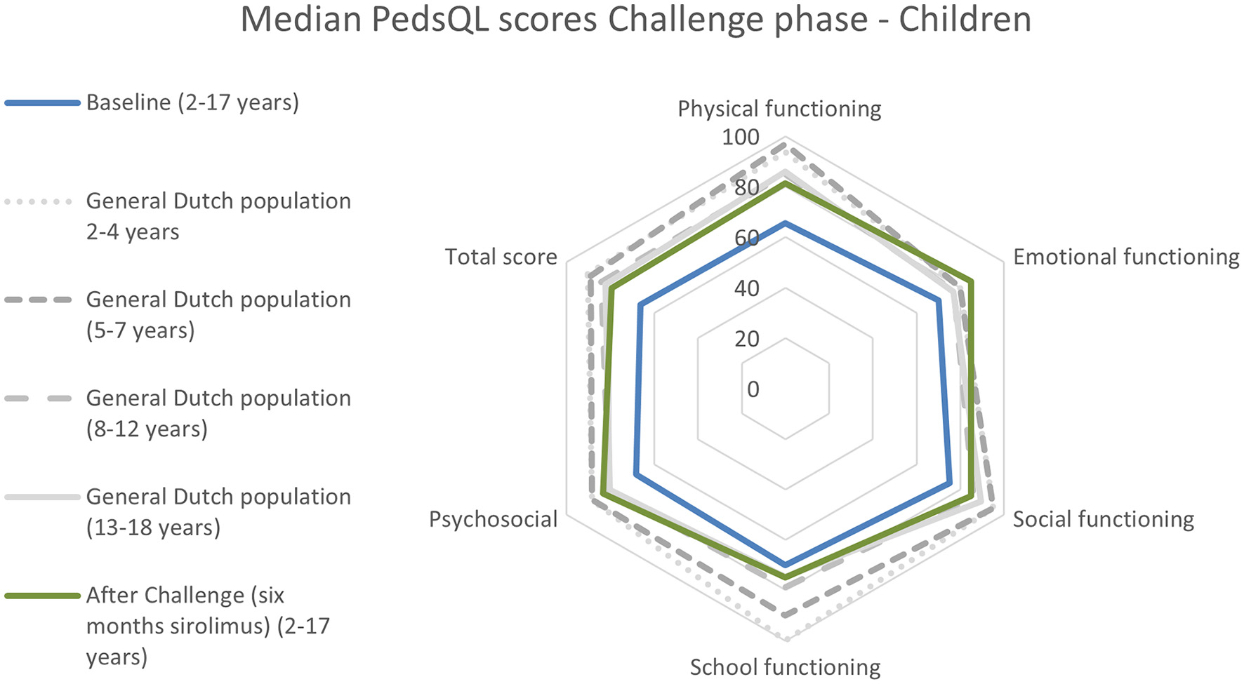 The changes in HRQoL after the sirolimus treatment were analyzed. The guidelines of the particular survey were followed to calculate the correct score when values were missing. Surveys were excluded from the analysis when the surveys at the baseline and/or at the end of the Challenge phase were missing.