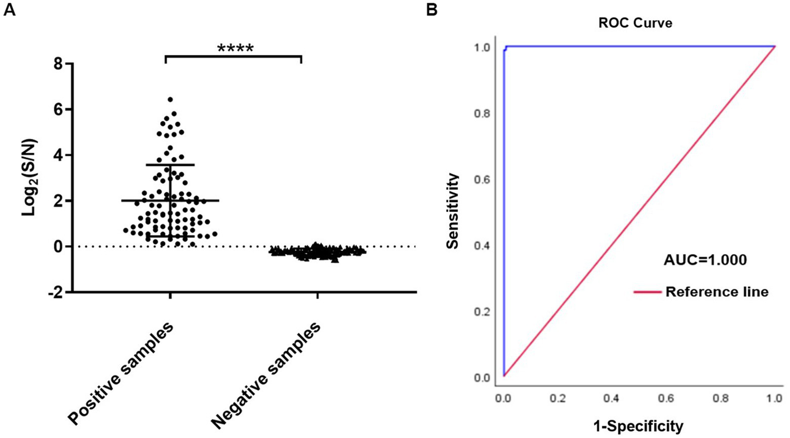 AlphaLISA results for throat swab samples. (A) Sample test results for positive versus negative; (B) ROC curve for LFIA vs. AlphaLISA (n = 228). ****p < 0.0001.