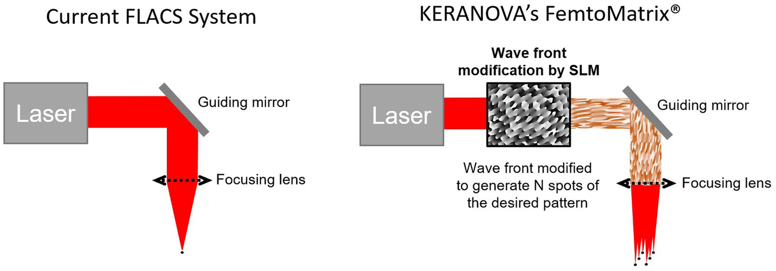 In the present article, a new generation of femtosecond lasers currently in development is presented: the FemtoMatrix® (see Figure 1). This mobile system can be installed and used in the operating room. It possesses photonic capability to drastically accelerate laser speed utilizing a Spatial Light Modulator (SLM) designed to modify, in real-time, the wavefront of the laser beam. During laser treatment, this enables - for the first time ever - reshaping the laser beam in the focal plane into a multispot matrix or variable geometry spots (Figure 2) thereby allowing the FemtoMatrix® to perform cuts at much higher speeds than the current standard of FLACS systems. The resulting effect is PhotoEmulsification®, incising the crystalline lens nucleus into a grid-like pattern of tiny cubes (see Figure 3). The surgeon may then remove the particles through simple irrigation/aspiration in an overwhelming majority of cases.