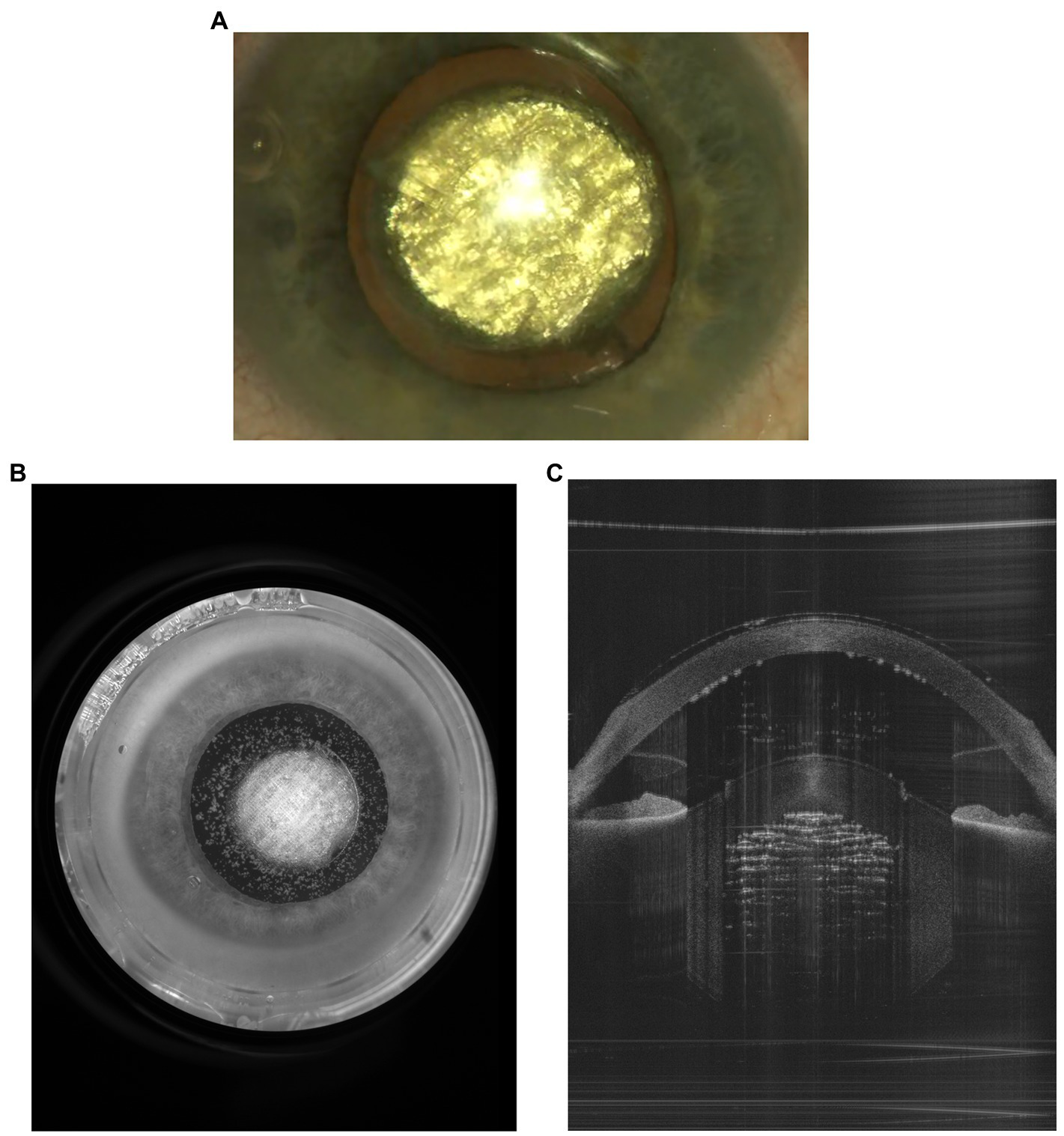 Figure 3. PhotoEmulsification® of a cataracted lens producing 200-μm cubes sized. (A) View from the surgical microscope, (B) capture from the FemtoMatrix® system (Frontview camera), (C) capture from the FemtoMatrix® system (OCT).