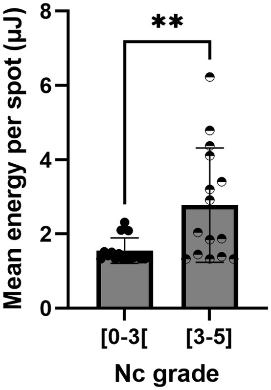 Customization of the laser treatment thanks to the TSS was evaluated by comparing the nucleus grade of the cataract and the mean energy per spot used for the PhotoEmulsification®.