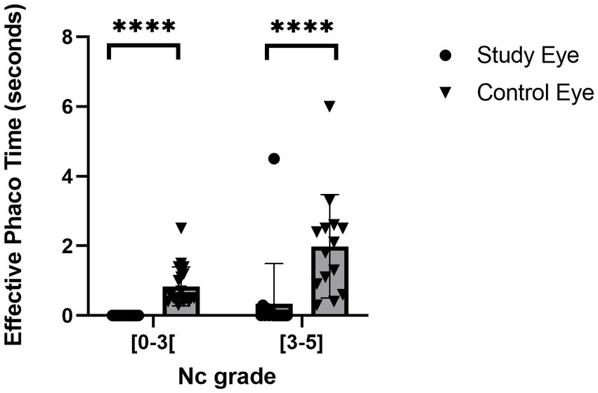 GraphPad Prism 9.4.1 for Windows (San Diego, CA, United States) was used to perform the statistical analysis. We compared sample means on parametric and non-parametric data sets using T-tests or Wilcox on matched pairs tests. Fisher’s exact test and Mann–Whitney test were used to compare distributions (for example, the number of zero-phaco procedures according to treatment and/or cataract grade). Statistical significance was defined as a p-value under 0.05.