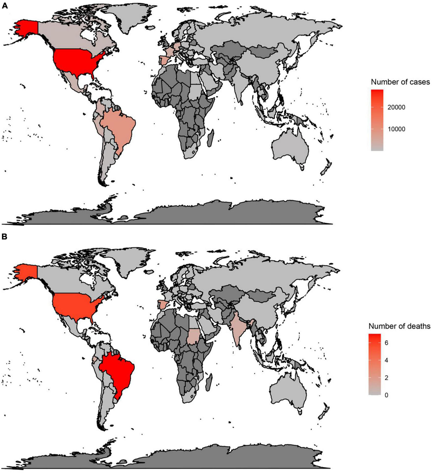 In countries with a history of monkeypox, the largest number of cases have been reported in Nigeria (552), the DRC (206), and Ghana (104) (Figure 1A) (3, 17, 39, 40). Moreover, deaths have been reported in Nigeria (7), Ghana (4), and Cameron (2) (Figure 1B) (3, 17, 39, 40). However, in the 2022 outbreak, from the 1st of January to the 24th of October, the largest number of cases were reported in the USA (28,004), Brazil (8,890), and Spain (7,277) (Figure 2A) (3, 17, 39, 40). Furthermore, in this same period the largest number of deaths were reported in Brazil (7), the USA (6), and Spain (2) (Figure 2B) (3, 17, 39, 40).