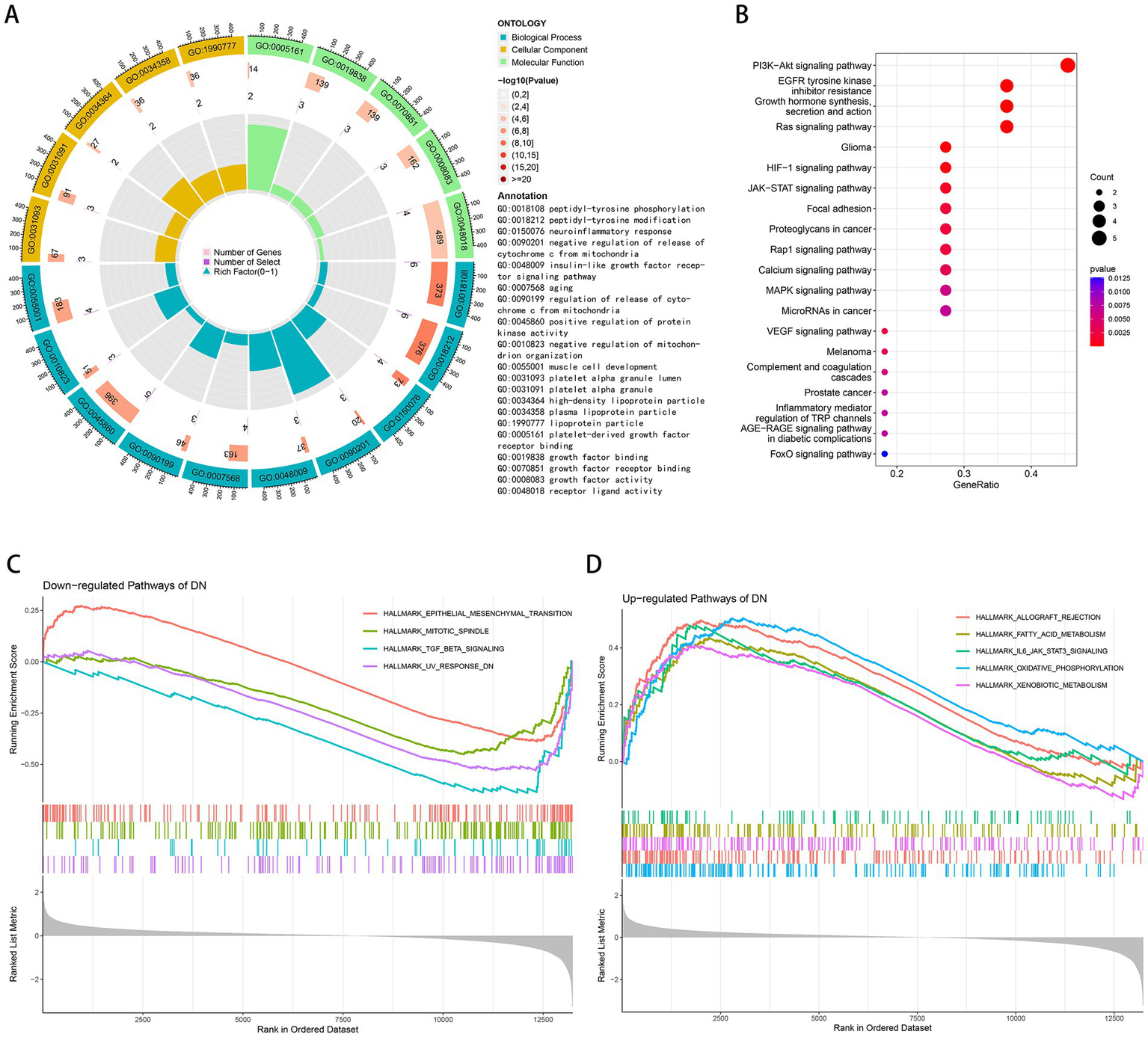 Functional and pathway enrichment analysis. (A) GO terms in the enrichment analysis of aging-related DEGs. (B) KEGG terms in the enrichment analysis of aging-related DEGs. (C) Down-regulated pathways of DN in the GSEA analysis. (D) Up-regulated pathways of DN in the GSEA analysis.