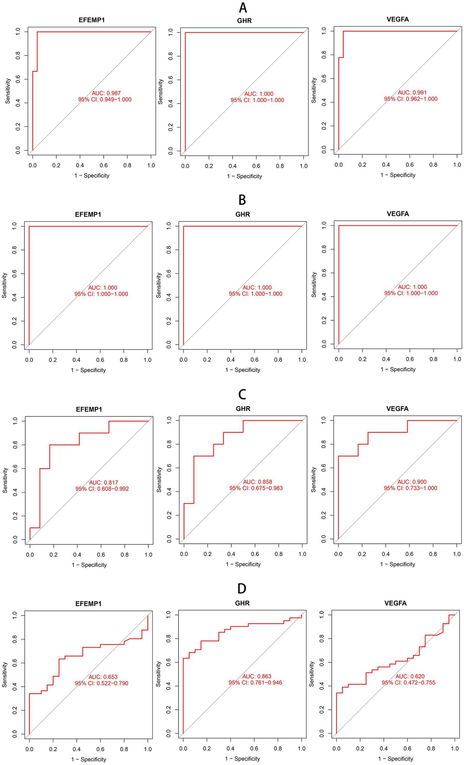 To estimate the predictive utility of the characteristic genes, we performed a ROC curve analysis and validated it in three independent cohorts. All three characteristic genes illustrated a remarkably distinguishing efficiency. AUC combines sensitivity and specificity and can authenticate the inherent validity of a diagnostic test. AUC values of EFEMP1, GHR and VEGFA were 0.987 (95% CI: 0.949–1.000), 1.000 (95% CI: 1.000–1.000) and 0.991 (95% CI: 0.962–1.000) in the DN training cohort, respectively (Figure 4A). The characteristic genes consistently showed excellent diagnostic performance in three independent test cohorts. AUC values of three characteristic genes were all 1.000 (95% CI: 1.000–1.000) in GSE1009 (Figure 4B). In GSE30529, AUC values of EFEMP1, GHR and VEGFA were 0.817 (95% CI: 0.608–0.992), 0.858(95% CI: 0.675–0.983) and 0.900 (95% CI: 0.733–1.000; Figure 4C). GHR maintained a high AUC value of 0.863 (95% CI: 0.761–0.946) in GSE96804 (Figure 4D). These characteristic genes could be considered potential diagnostic biomarkers for DN.