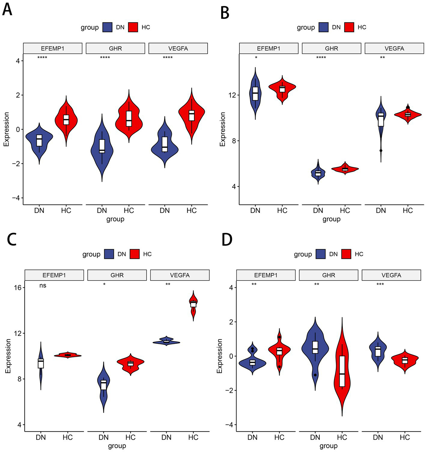 Expression patterns of the characteristic genes in the Nephroseq V5 database. (A) Box plots of the expression about three characteristic genes in the DN samples and healthy living donors. (B–D) Box plots of the expression about GHR (B), VEGFA (C) and EFEMP1 (D) in multiple renal diseases.