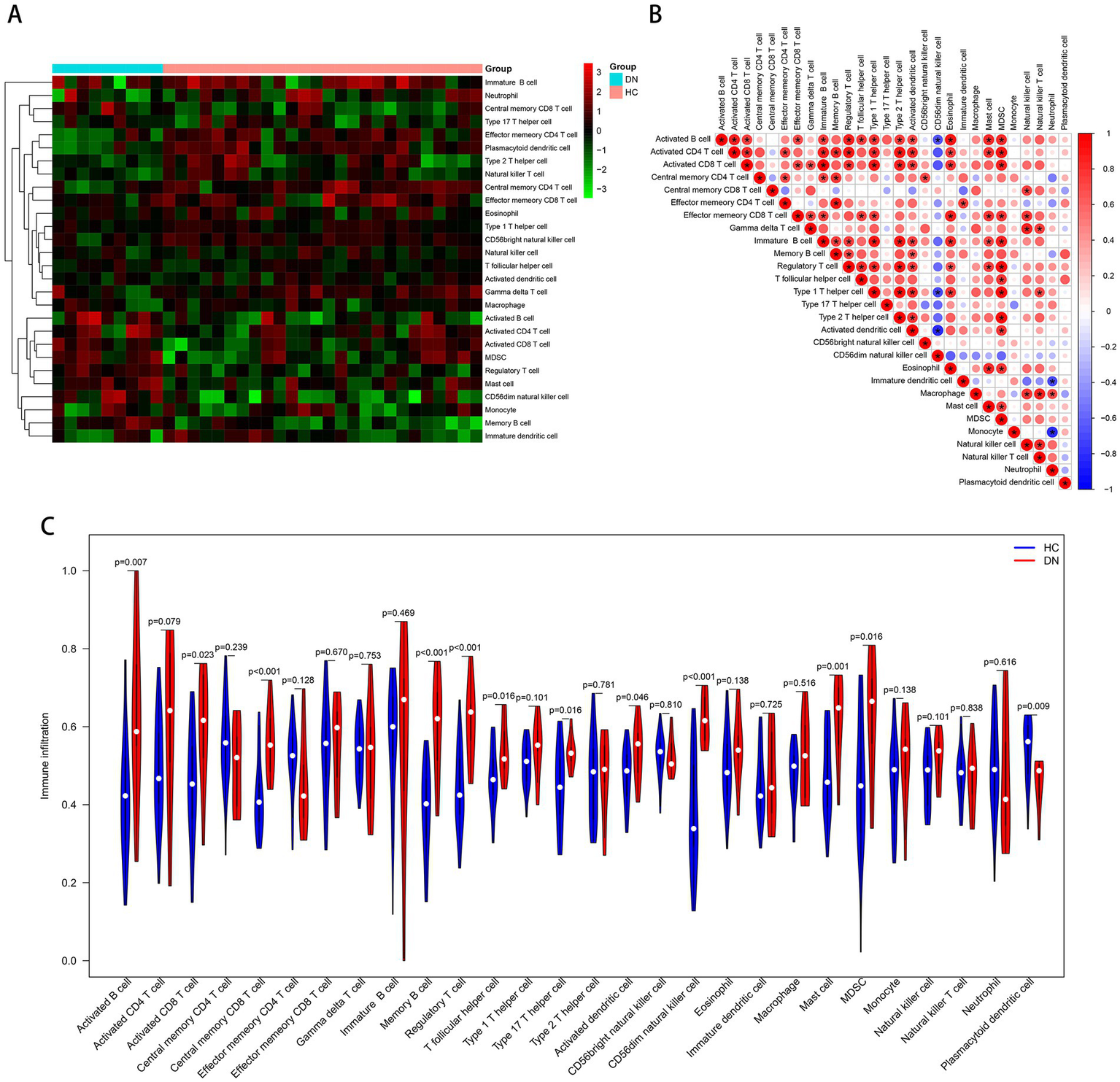 Immune cell infiltration analysis based on the ssGSEA algorithm. (A) The infiltration degree of 28 immune cells in each sample. Red squares indicate higher immune infiltration expression, and green squares indicate lower expression. (B) Correlation matrix of infiltration degree of immune cells in DN samples. (C) Violin plot of the differential analysis of each immune cell between two groups.
