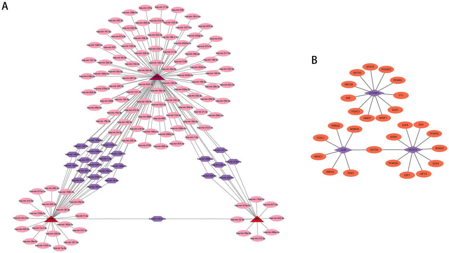 We employed publicly available bioinformatic databases to reveal the potential changes and molecular regulatory mechanisms happening at the transcriptional level for the characteristic genes (Supplementary Table 2). miRNAs corresponding to the characteristic genes were predicted, and the mRNA-miRNA network based on the TarBase repository was constructed (Figure 9A); these genes were linked together by multiple shared miRNAs. There were 17 miRNAs associated with VEGFA and EFEMP1, 6 miRNAs associated with GHR and VEGFA, and 1 miRNA associated with GHR and EFEMP1. The potential TFs from the JASPAR database were acquired and the mRNA-TF network was developed (Figure 9B), and GATA2 has a regulatory effect on both GHR and VEGFA.